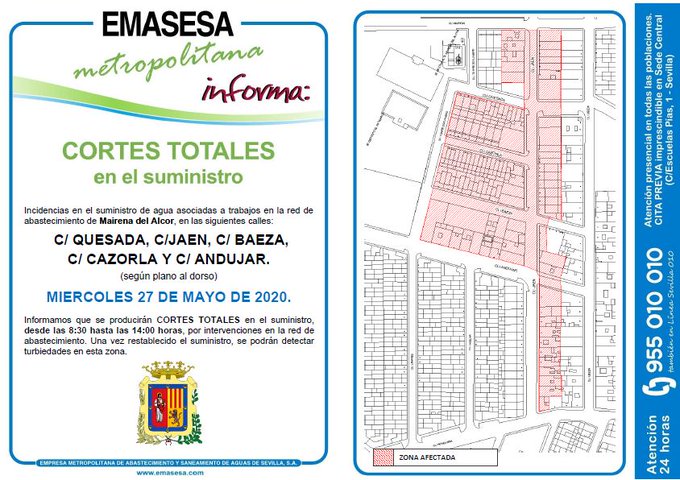 Emasesa Metropolitana informa que el miércoles día 27 de mayo, desde las 8.30 hasta las 14.00 horas, se producirán cortes totales en el suministro de agua en las calles Quesada, Jaén, Baeza, Cazorla y Andújar.