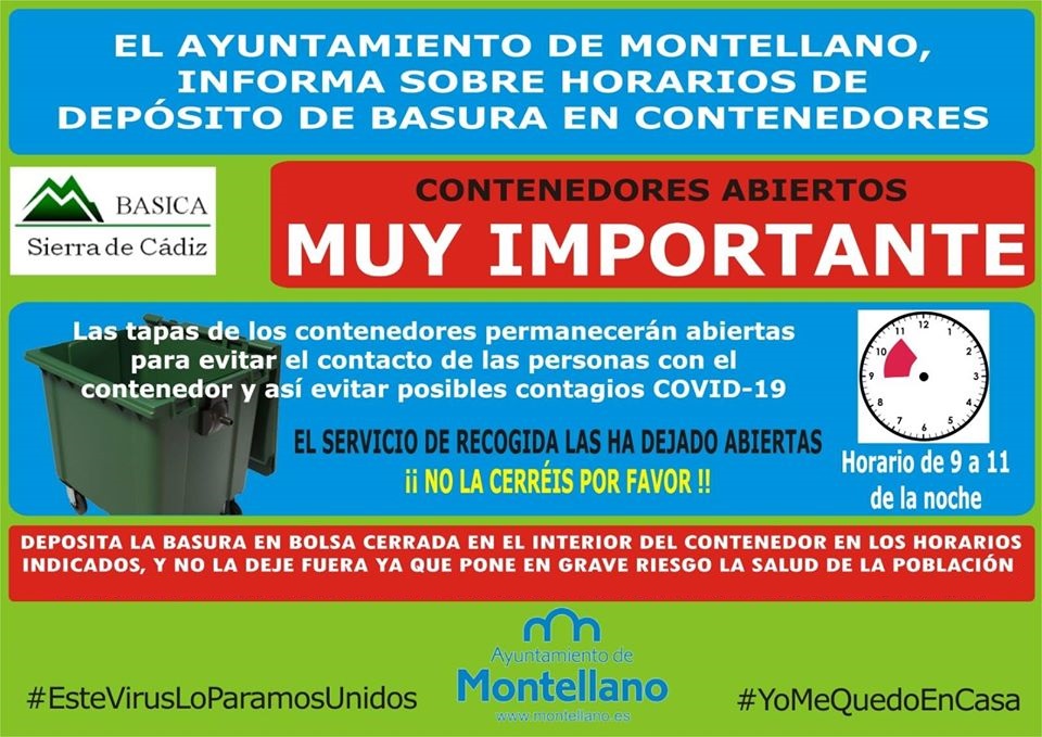 Debido a las subidas de las temperaturas en esta época del año, y para evitar molestias al resto de vecinos y vecinas, se pide que la basura se deposite en los contenedores habilitados, en el horario establecido para ello: a partir de las 21:00 horas de la tarde.