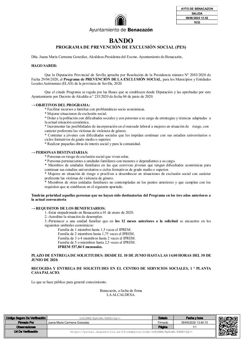 Desde el Ayuntamiento de Benacazón te informamos que la Diputación Provincial de Sevilla ha aprobado la Resolución de la Presidencia número Nº 2083/2020 de Fecha 29/04/2020, que incluye el Programa de Prevención de Exclusión Social 2020 para los Municipios y Entidades Locales Autónomas (ELAS) de la provincia de Sevilla.
