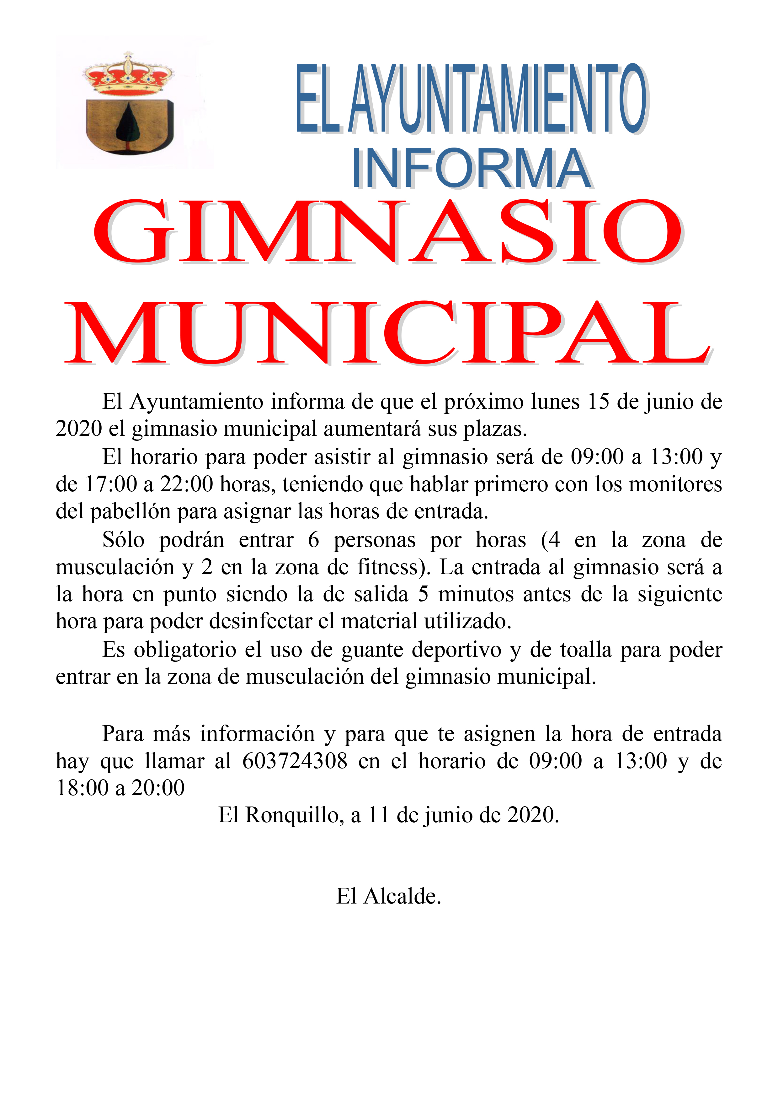 El Ayuntamiento informa de que el próximo lunes 15 de junio de 2020 el gimnasio municipal aumentará sus plazas.