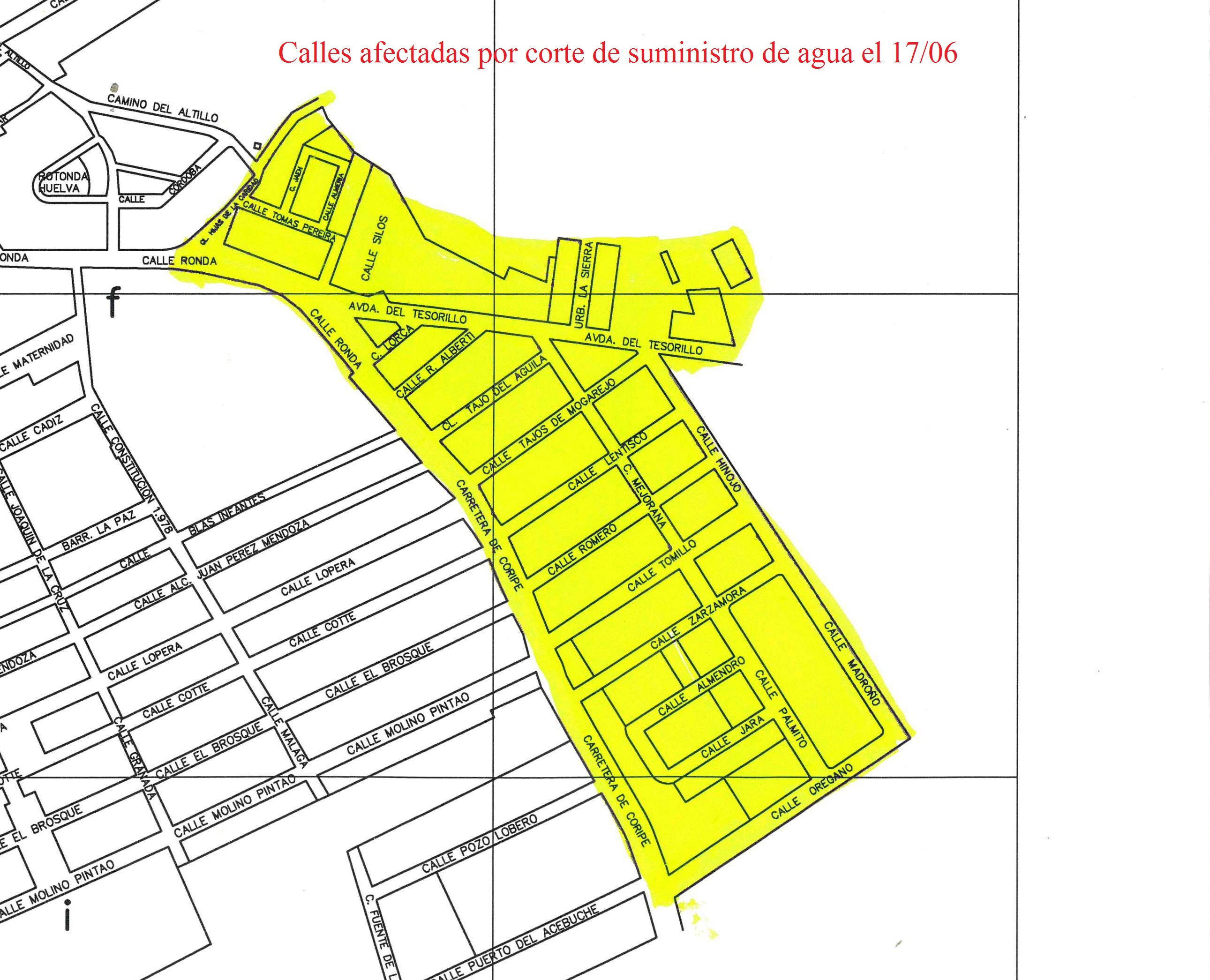 Calles afectadas: parte de Calle Ronda, parte Carretera Coripe, Avda. del Tesorillo, Calle Hijas de la Caridad, Calle Tomás Pereira, Calle Jaén, Calle Almería, Calle Silos, Calle Federico García Lorca, Urbanización La Sierra, Calle Rafael Alberti, Calle Lentisco, Calle Romero, Calle Mejorana, Calle Tomillo y Urbanización 160 viviendas.