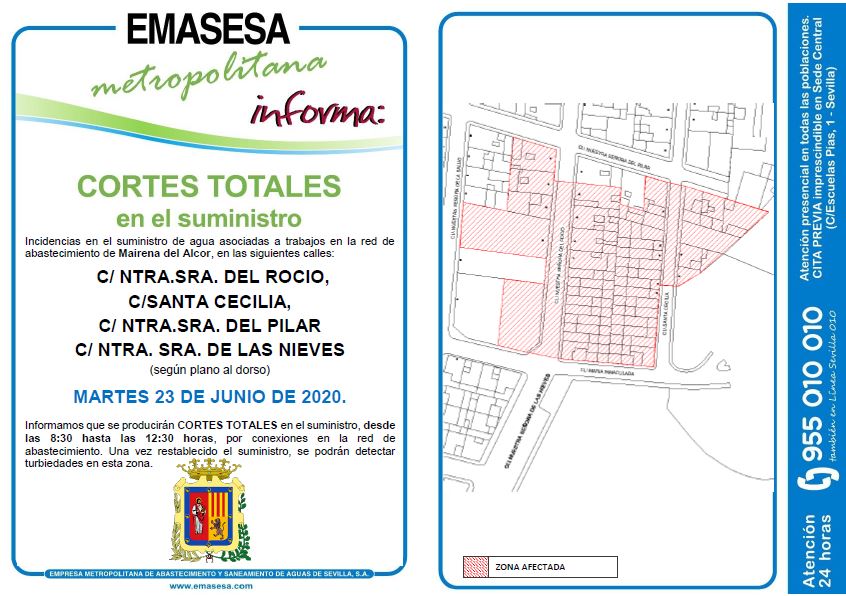 Emasesa Metropolitana informa que el martes día 23 de junio, desde las 8.30 hasta las 12.30 horas, se producirán cortes totales en el suministro de agua en las calles Ntra. Sra. del Rocío, Santa Cecilia, Ntra. Sra. del Pilar y Ntra. Sra. de las Nieves.
