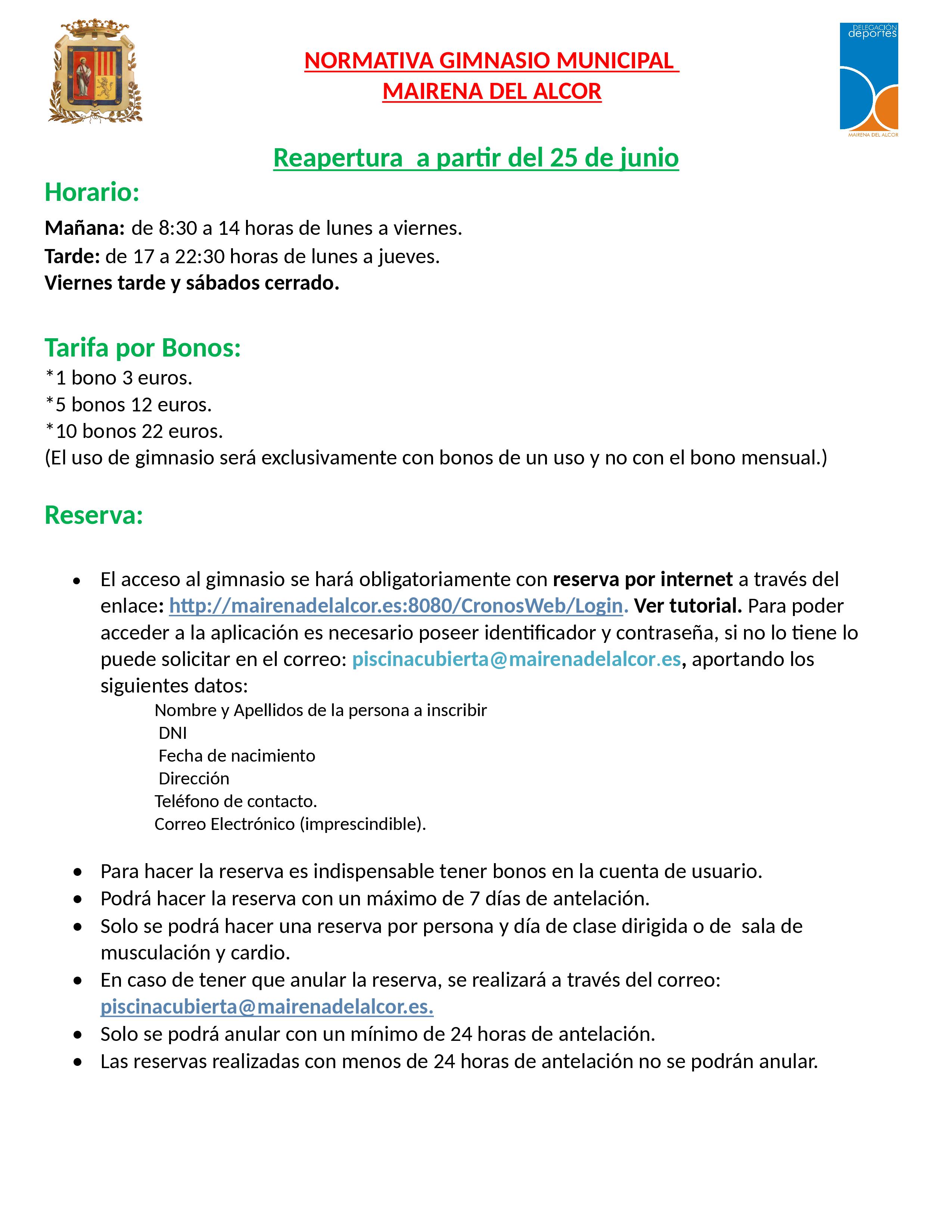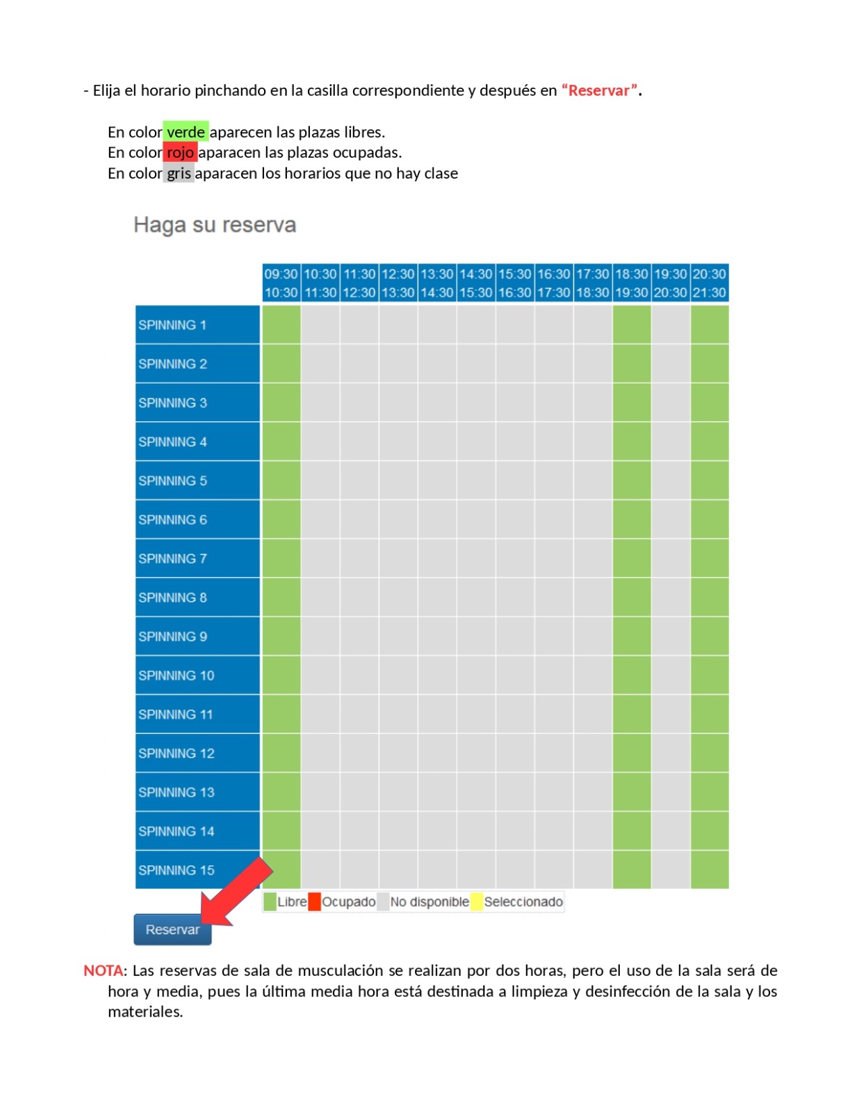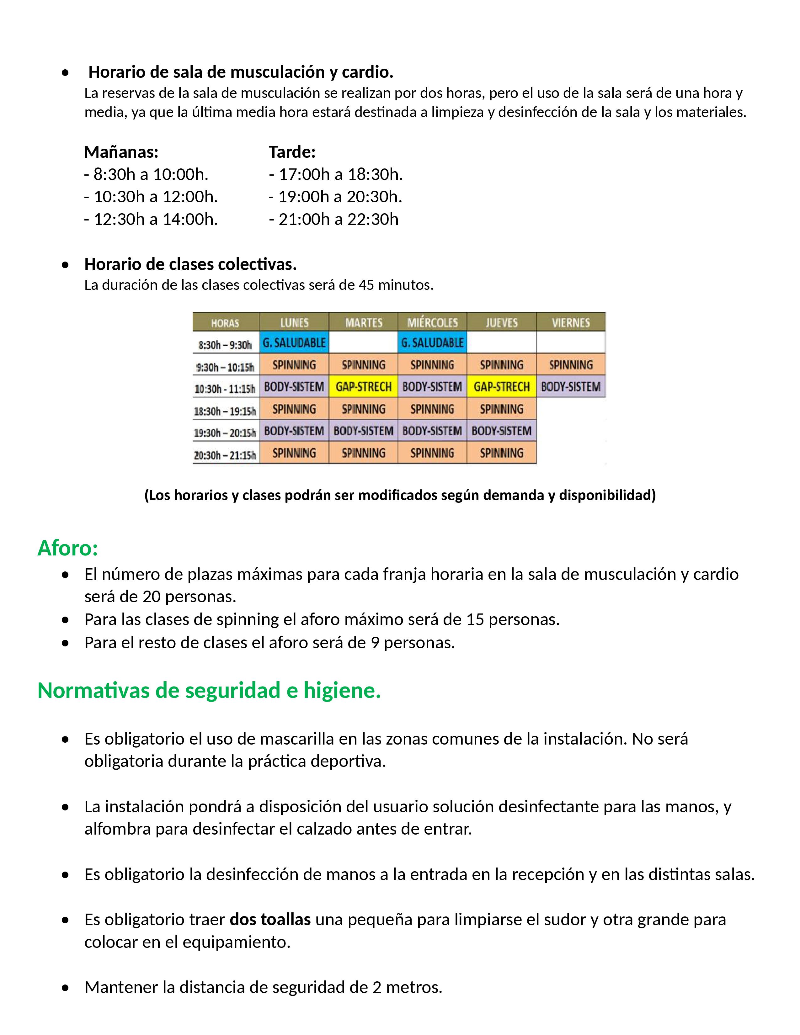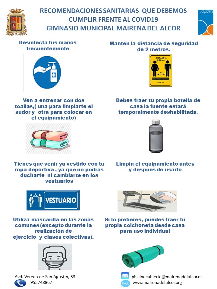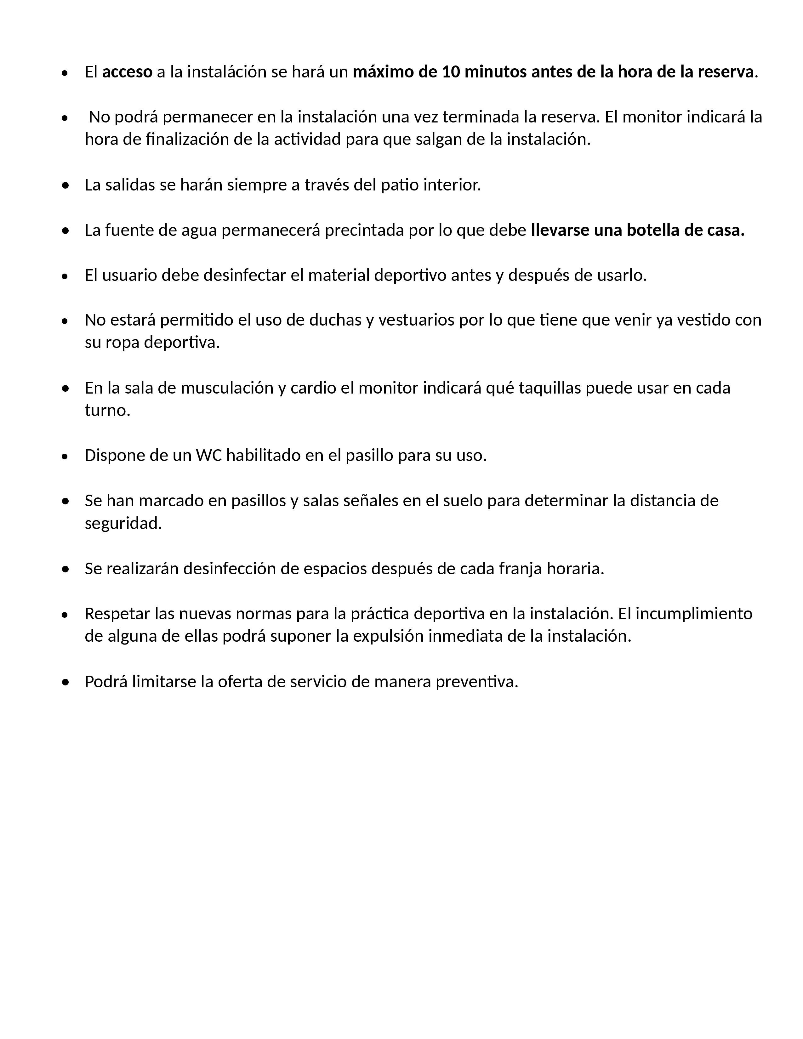 Recordatorio: uso de 2 toallas y la botella de agua que deben traer de casa, además, de realizar la reserva previa.