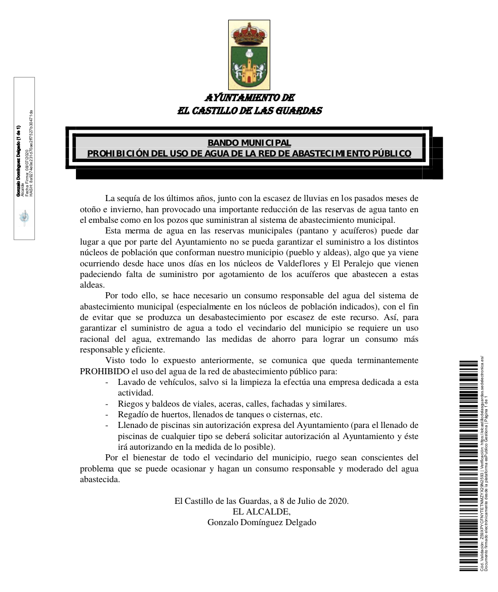 El ayuntamiento de El Castillo de las Guardas ha publicado un Bando, con fecha de 8 de abril de 2020, en el que recomienda el ahorro y reducción de consumo de agua en los hogares y en algunos casos, prohíbe su uso.