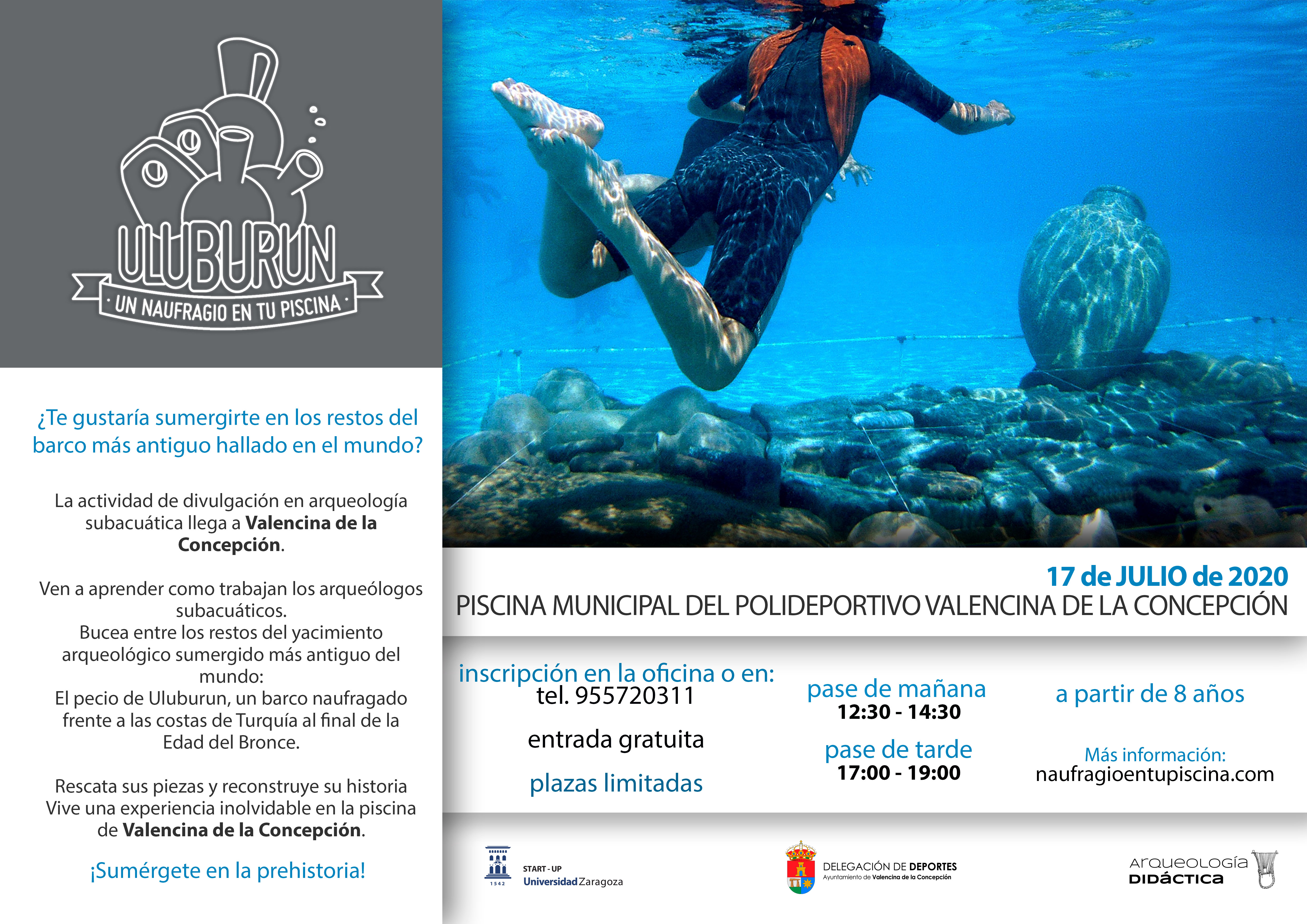 El Ayuntamiento de Valencina pondrá en marcha, a través de la delegación municipal de Deportes, una nueva actividad para el viernes 17 de julio. La iniciativa, "Uluburun. Un naufragio en tu piscina", consiste en un ejercicio de arqueología subacuática en la piscina municipal del Polideportivo de Valencina.