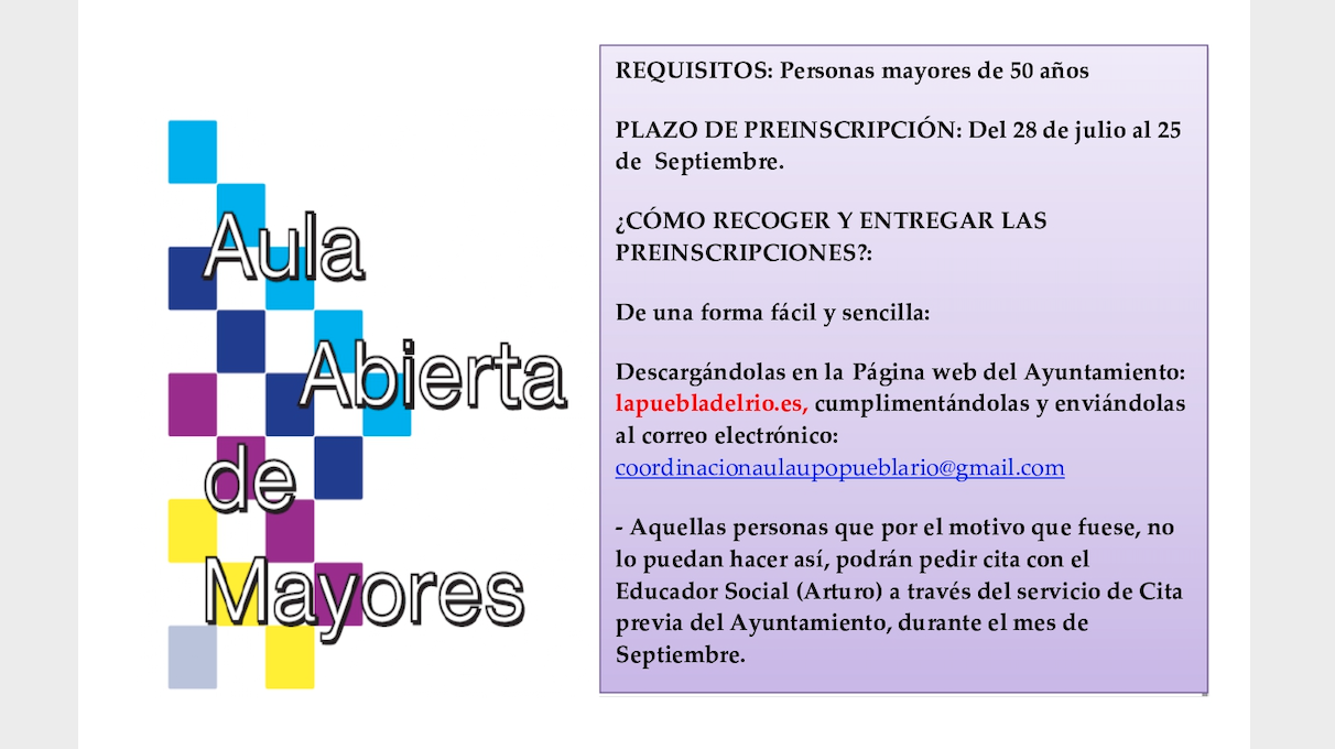 Desde el Ayuntamiento de La Puebla del Río informamos sobre el plazo de preinscripción en el curso 2020/2021 del Aula Abierta de Mayores de la Universidad Pablo de Olavide.