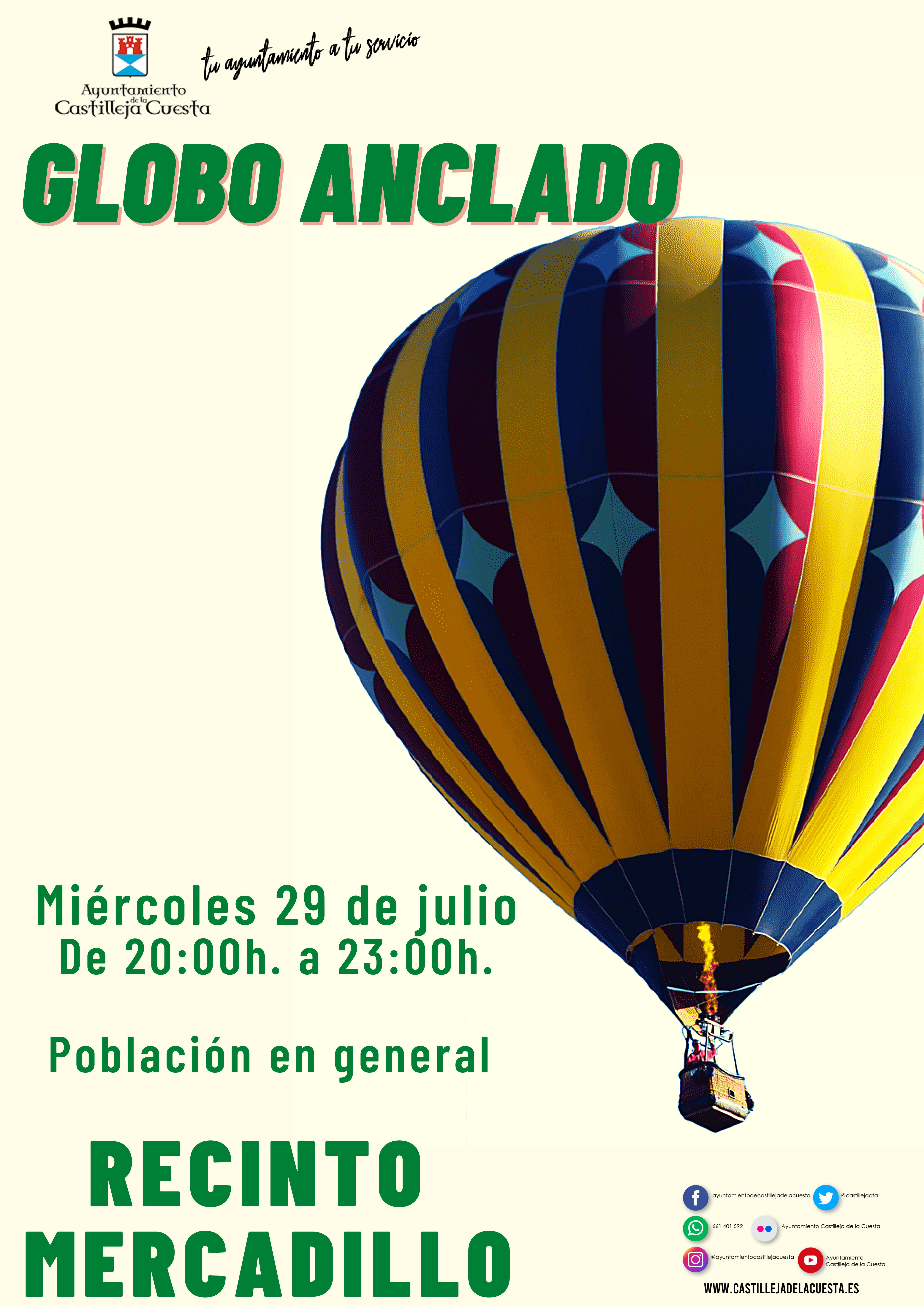 Fecha inicio Mié, 29/07/2020 - 20:00 Fecha fin Mié, 29/07/2020 - 23:00 Imágenes Ubicación Categoría evento Ciudadanía Mostrar en el carrusel de la sección No Más información http://www.castillejadelacuesta.es/es/actualidad/eventos/Globo-anclado/