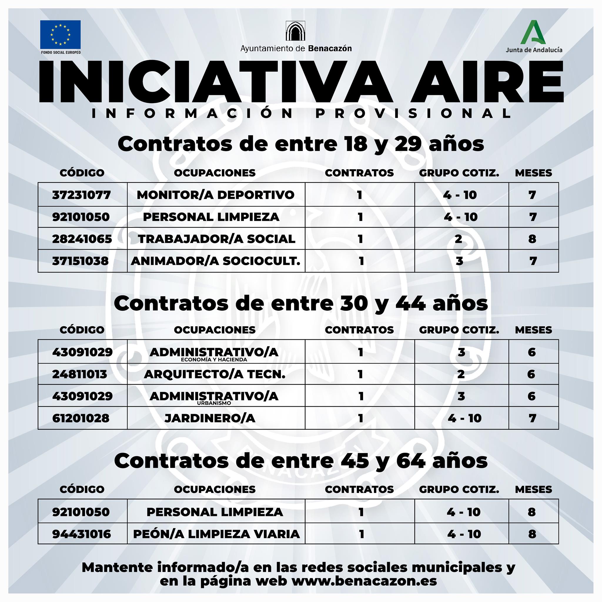Desde el Ayuntamiento de Benacazón te mostramos la relación de puestos que el Área municipal de Desarrollo Local y de Empleo han solicitado para la nueva Iniciativa para la Activación, Impulso y Recuperación del Empleo (Iniciativa AIRE), que gracias a fondos europeos la Junta de Andalucía destina a facilitar la contratación de personas desempleadas por parte de los ayuntamientos andaluces.