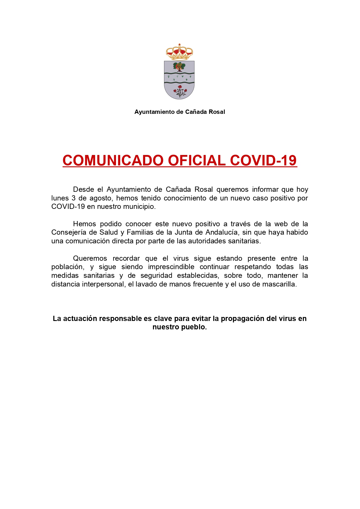 Imagen Ubicación Categoría noticia COVID-19 Mostrar en el carrusel de la sección No Fecha Lun, 03/08/2020 - 11:59 Más información http://www.canadarosal.es/es/actualidad/noticias/COMUNICADO-COVID-AYUNTAMIENTO/