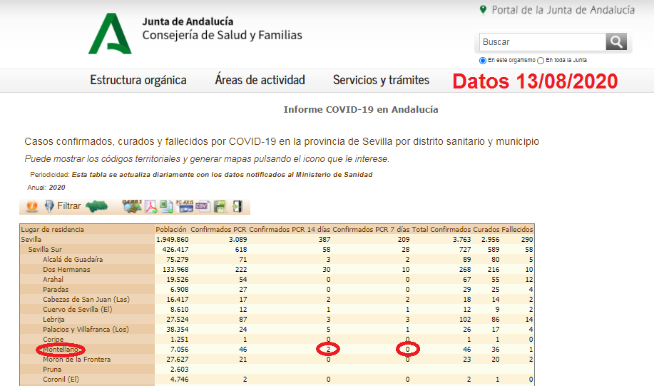 #COVID19 En el día de hoy se han vuelto a actualizar los datos de contagiados por COVID-19 en Montellano. Según publica la Junta de Andalucía en su web, son 2 los confirmados en los últimos 14 días y 0 en los últimos 7 días.