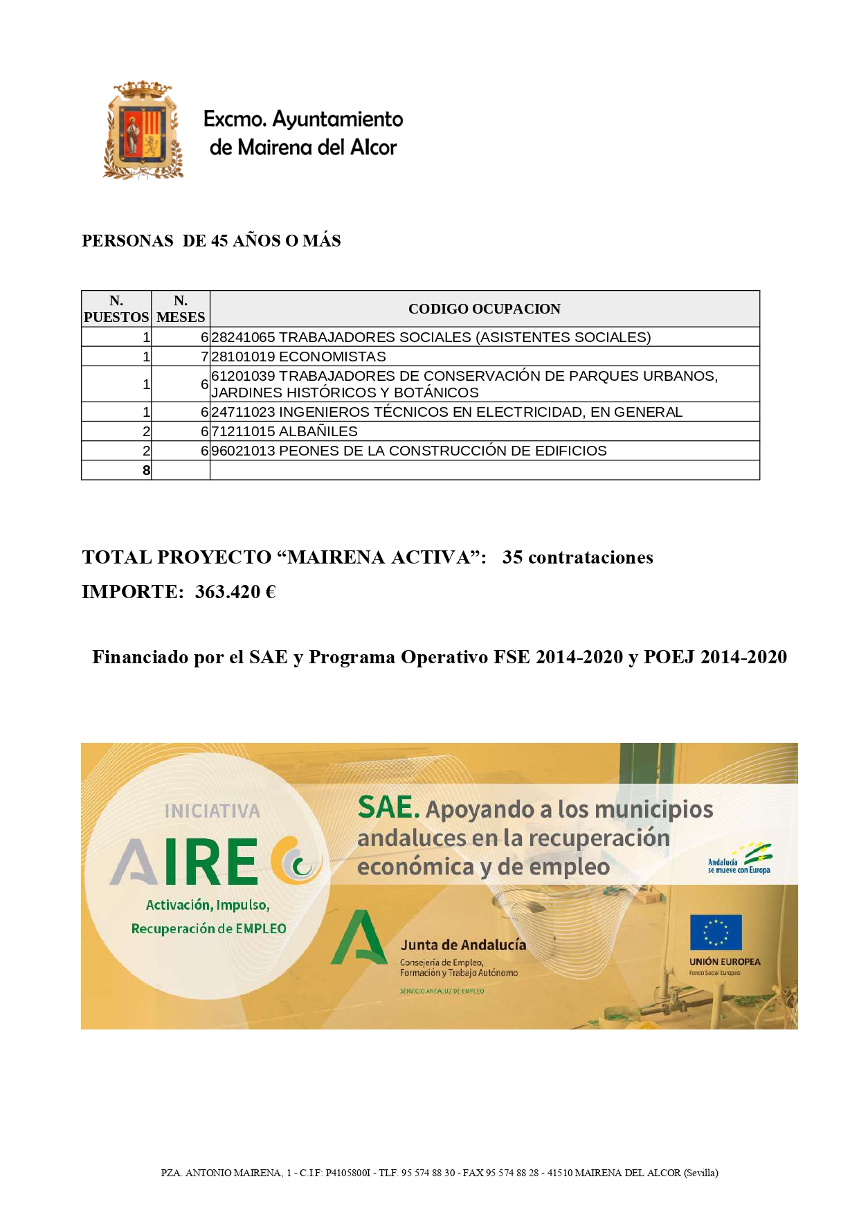 En total serán 35 contrataciones dentro del proyecto Mairena Activa por importe de 363 420 euros.