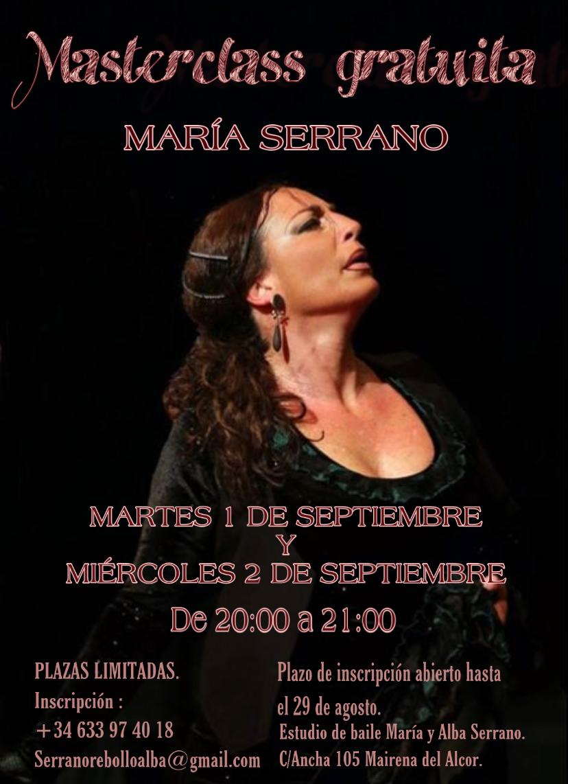 La bailaora del LIX Festival de Cante Jondo Antonio Mairena, Maria Serrano, impartirá una masterclass gratuita los días 1 y 2 de septiembre de 20 a 21 horas en el Estudio de Baile Maria & Alba Serrano.