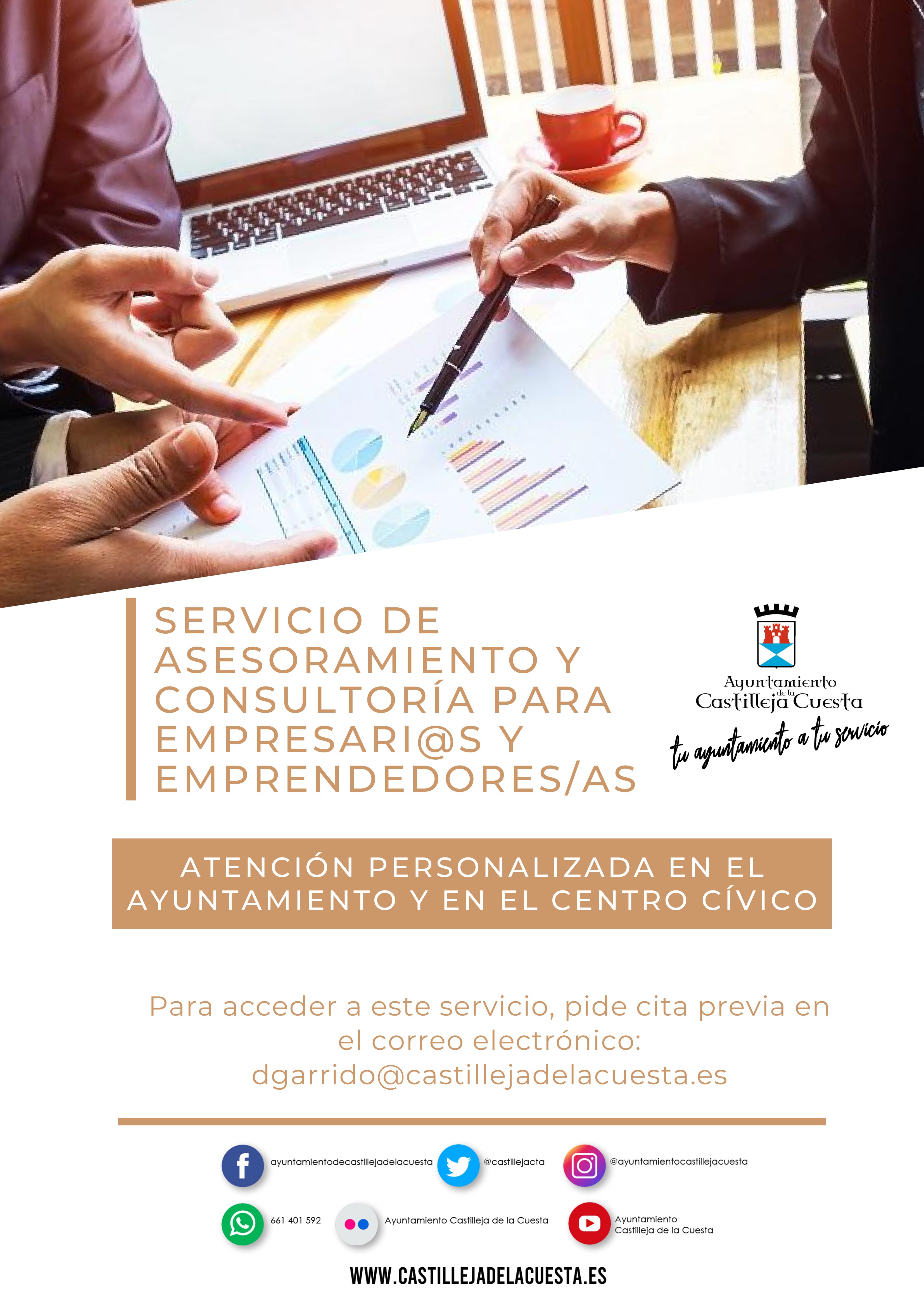 El Ayuntamiento ha puesto en marcha un servicio de asesoramiento y consultoría para empresarios/as y emprendedores/as que tendrá como objetivo proporcionar conocimientos y herramientas específicas personalizadas a todas aquellas personas que quieran impulsar su negocio en Castilleja de la Cuesta, además de asesorar a aquellos/as empresarios/as que necesiten información sobre cualquier servicio para su empresa.