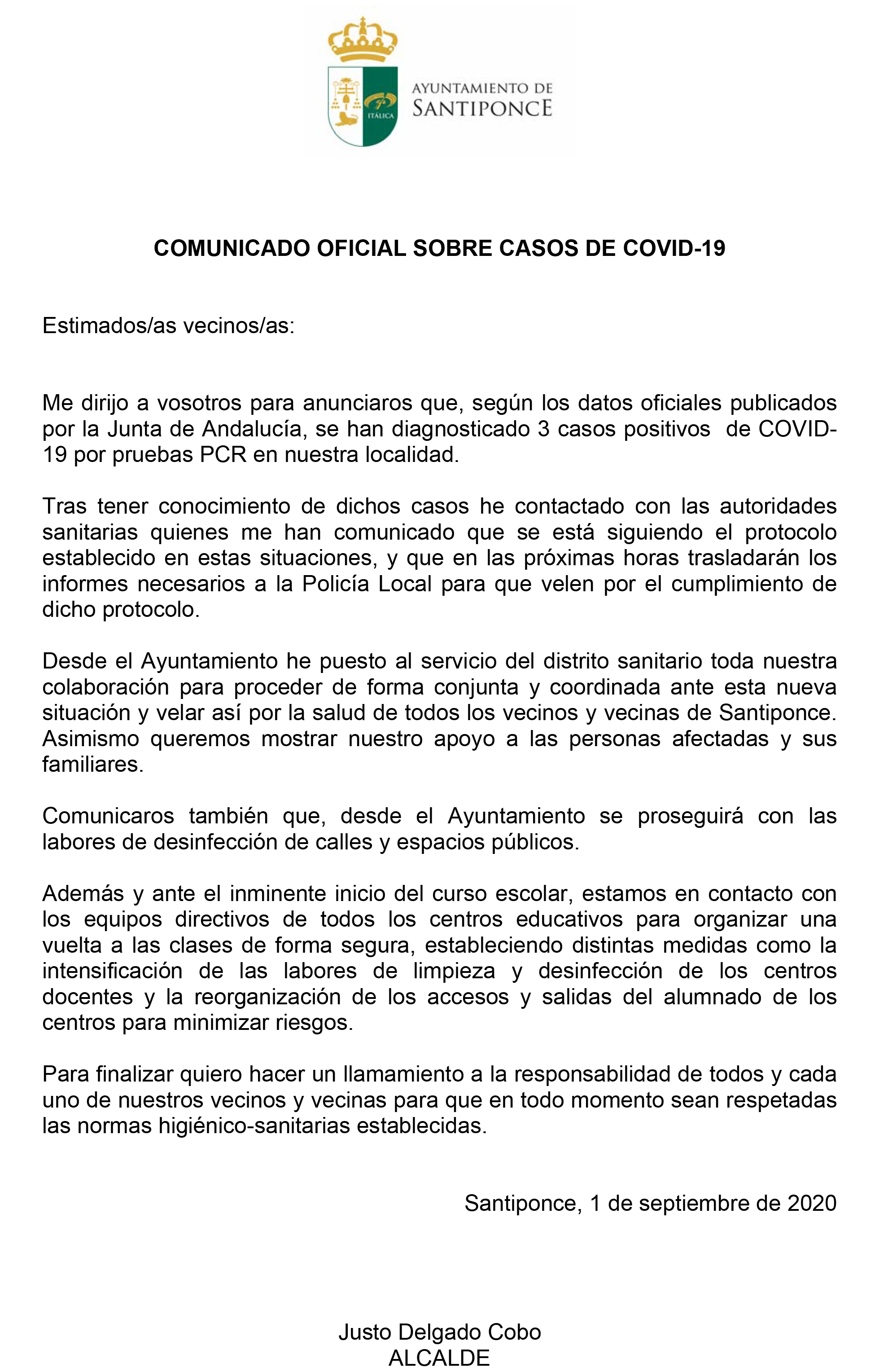 Me dirijo a vosotros para anunciaros que, según los datos oficiales publicadospor la Junta de Andalucía, se han diagnosticado 3 casos positivos de COVID-19 por pruebas PCR en nuestra localidad.