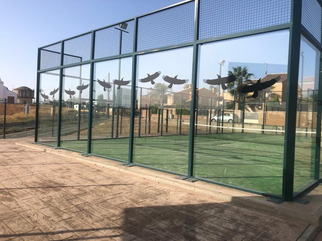 Hoy han quedado colocados estos vinilos con forma de pájaro en las cristaleras de las pistas de Pádel.