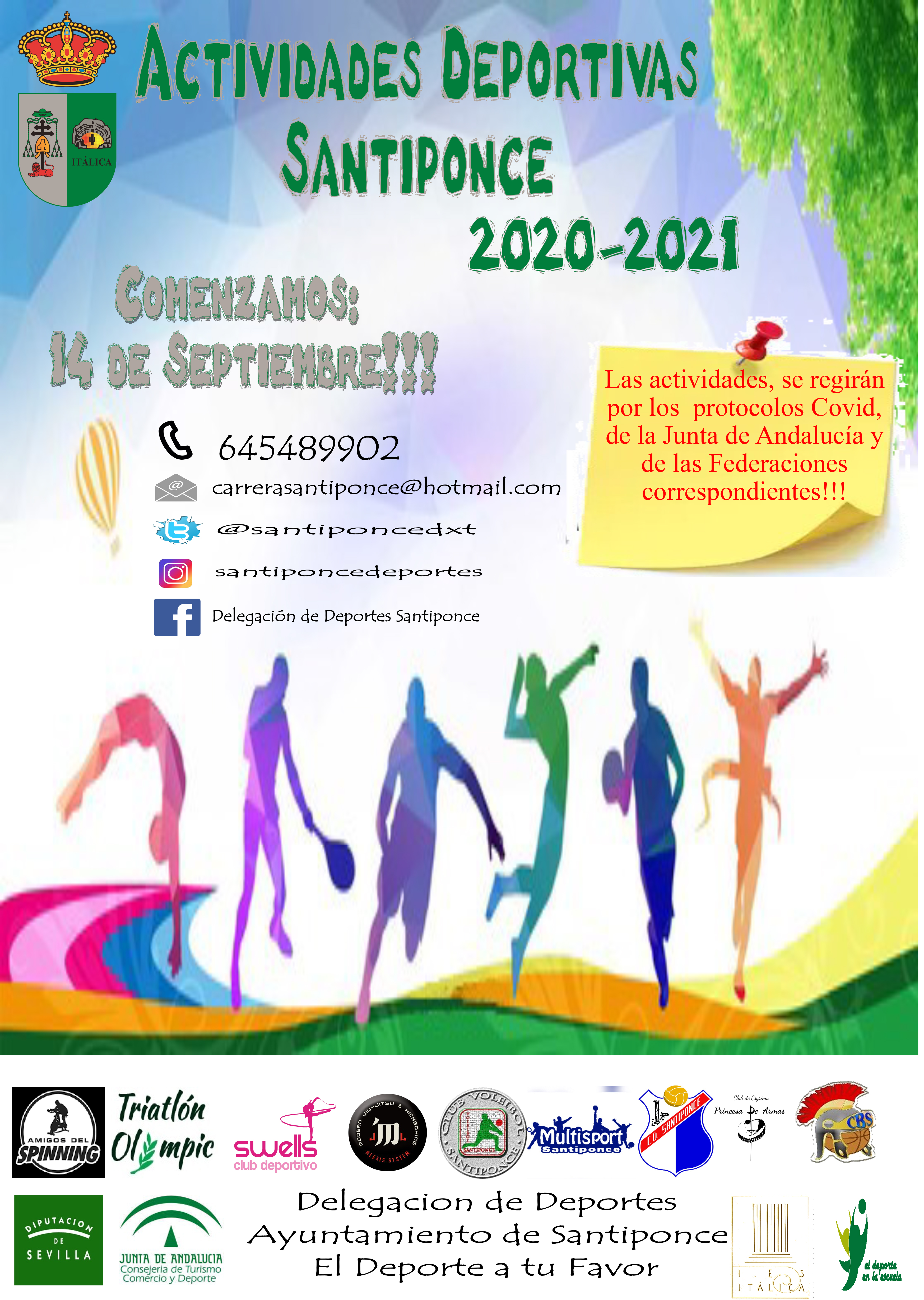 Informamos a nuestros vecinos y vecinas que, si la situación sanitaria lo permite, el próximo 14 de septiembre se retomarán las actividades deportivas en Santiponce, impulsadas por la Delegación de Deportes de este Ayuntamiento. A continuación, os ofrecemos la relación de normas e indicaciones a seguir por usuarios y usuarias: