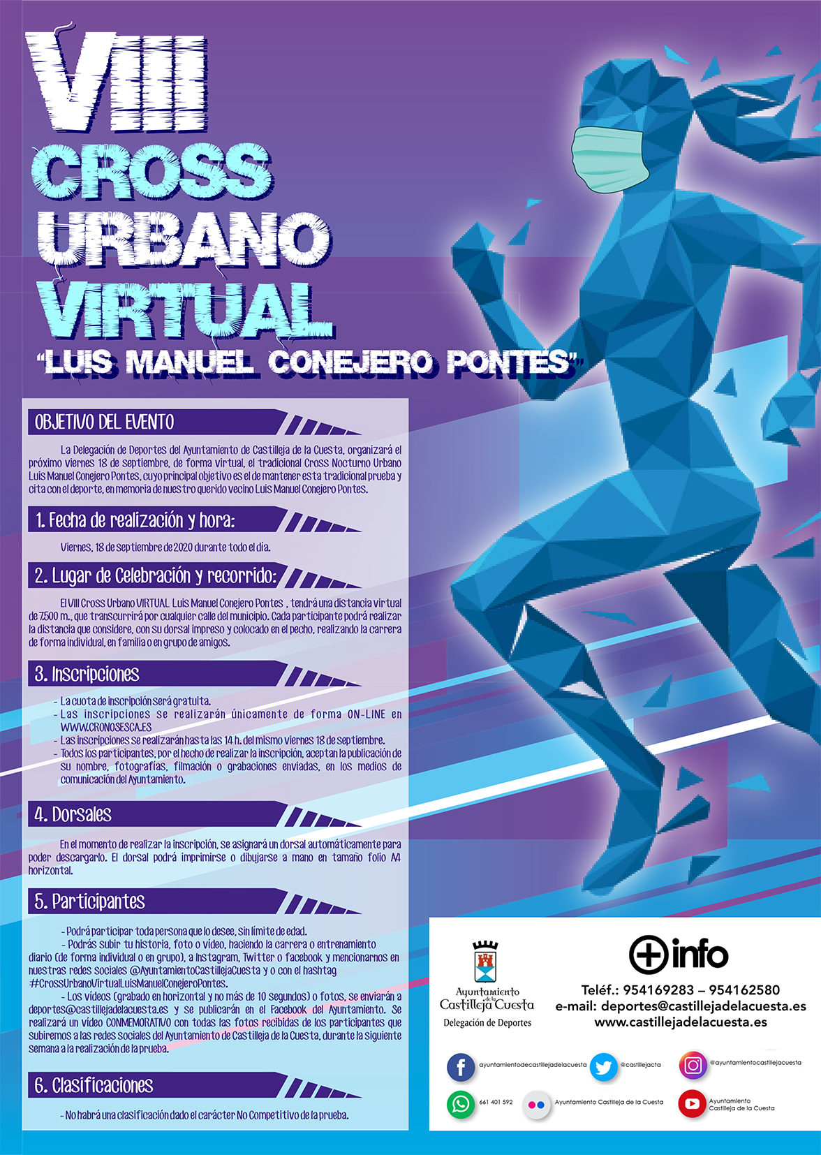 El VIII Cross Urbano VIRTUAL "Luis Manuel Conejero Pontes", tendrá una distancia virtual de 7.500 m., que transcurrirá por cualquier calle del municipio. Cada participante podrá realizar la distancia que considere, con su dorsal impreso y colocado en el pecho, realizando la carrera de forma individual, en familia o en grupo de amigos.