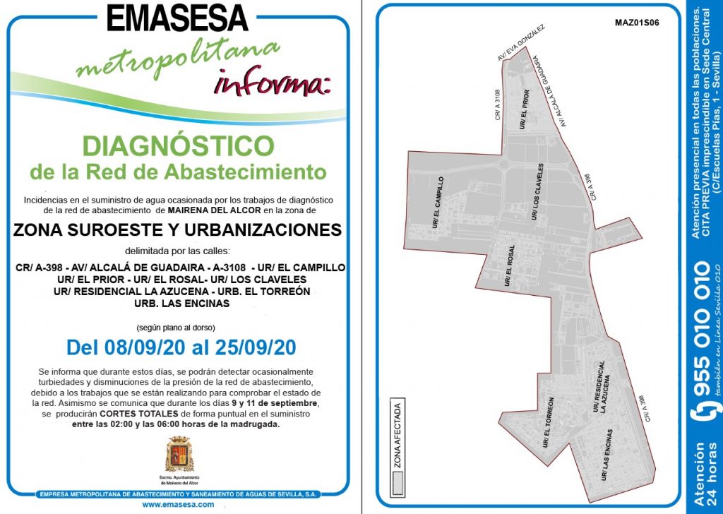 Emasesa Metropolitana informa que del 8 al 25 de septiembre se producirán incidencias en el suministro de agua, ocasionadas por los trabajos de diagnóstico en la red de abastecimiento de las zonas centro (calles Ancha, Arrabal, Sevilla, Velarde, camino de las Minas y plaza de Alconchel), suroeste (avenida Alcalá de Guadaíra y barrio el Prior) y urbanizaciones (el Campillo, el Rosal, los Claveles, la Azucena, el Torreón y las Encinas).