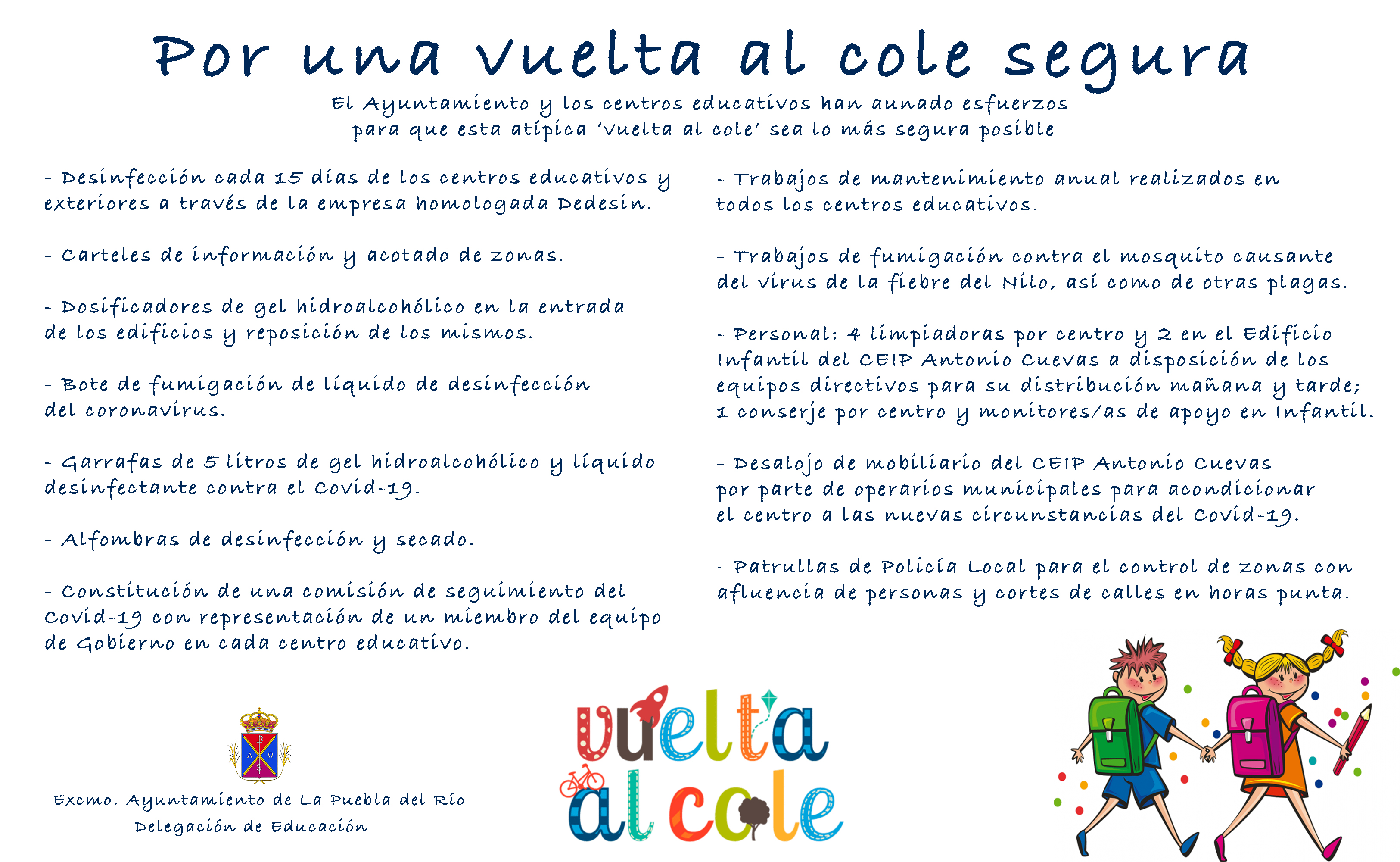 El Ayuntamiento de La Puebla del Río y la Comunidad Educativa de la localidad han aunado esfuerzos para que esta atípica 'vuelta al cole' de cara al comienzo del curso 2020/2021 sea lo más segura posible dentro de la situación sanitaria que estamos viviendo a causa del Covid-19.