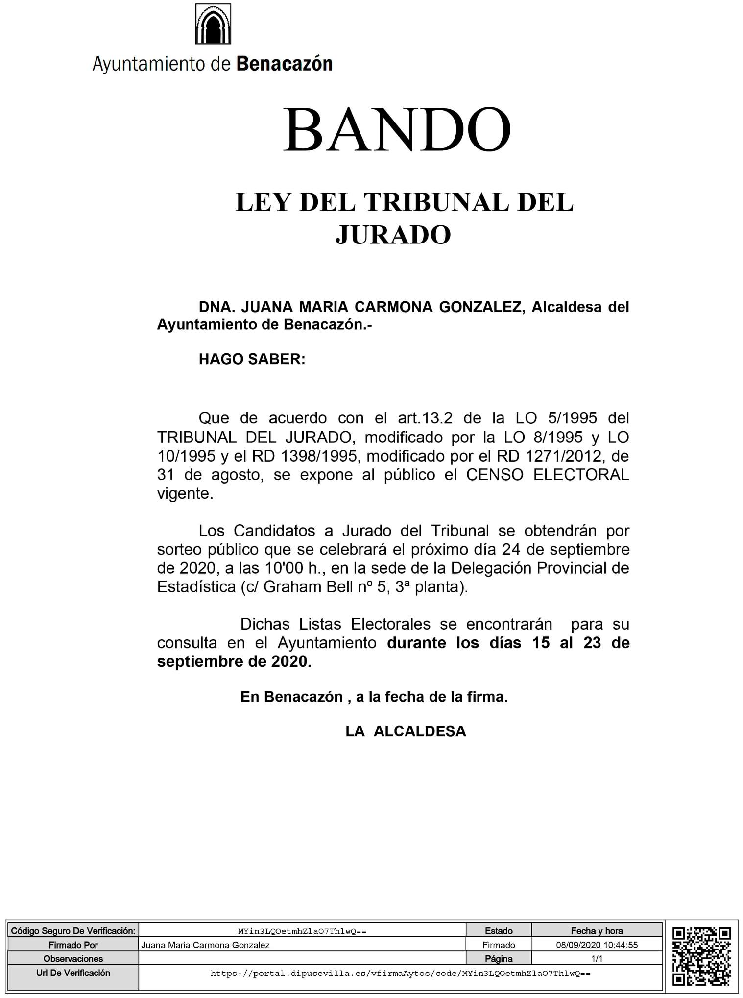 Las personas candidatas a Jurado del Tribunal se obtendrán por sorteo público que se celebrará el próximo día 24 de septiembre de 2020 a las 10.00 horas en la sede de la Delegación Provincial de Estadística (c/ Graham Bell nº5, 3ª planta). Dichas Listas Electorales se encontrarán para su consulta en el Ayuntamiento durante los días 15 al 23 de septiembre de 2020