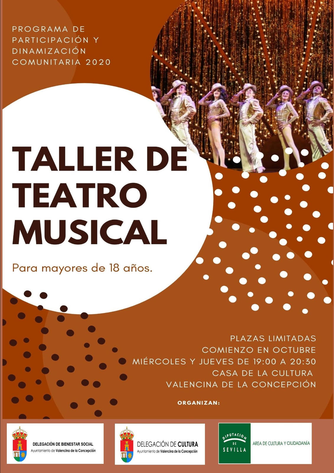 El Ayuntamiento de Valencina, a través de las delegaciones municipales de Bienestar Social y Cultura, y junto al área de Cultura y Ciudadanía de la Diputación de Sevilla, informan del próximo inicio de un Taller de Teatro Musical destinado a mayores de 18 años, empadronados/as en Valencina, que dará comienzo en el mes de octubre. Las plazas son limitadas.