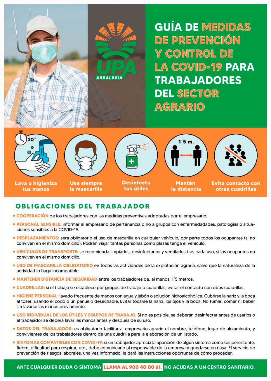 Desde el Ayuntamiento de Benacazón te trasladamos la Guía de medidas de prevención y control de la COVID-19 para trabajadores/as del sector agrario elaborada por la asociación UPA. Esta guía está basada en las recomendaciones establecidas por el Ministerio de Agricultura, Pesca y Alimentación, el Ministerio de Trabajo y Economía Social, varias sociedades médicas y las propias comunidades autónomas a través de la Comisión de Salud Pública.