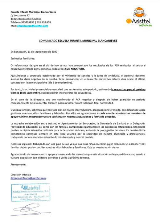 Desde el Ayuntamiento de Benacazón te trasladamos el último comunicado emitido por Asisttel Infancia, empresa concesionaria del servicio de guardería de la Escuela Infantil Blancanieves, donde se informa que, tras el negativo de las pruebas PCR realizadas a todas sus docentes, las autoridades sanitarias permitirán la vuelta a las clases en torno al viernes 18 de septiembre.