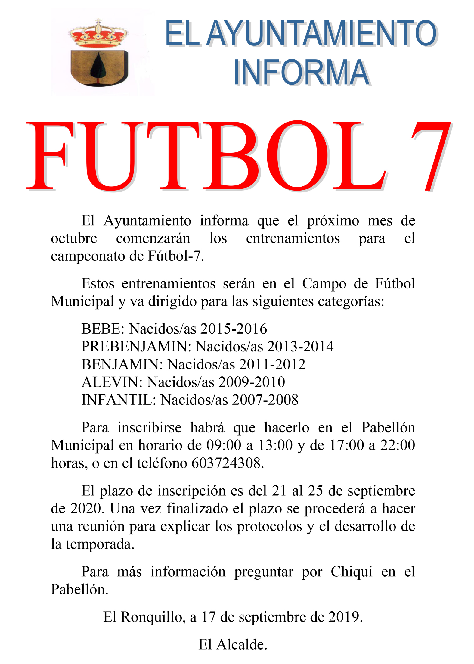 El Ayuntamiento informa que el próximo mes de octubre comenzarán los entrenamientos para el campeonato de fútbol 7.