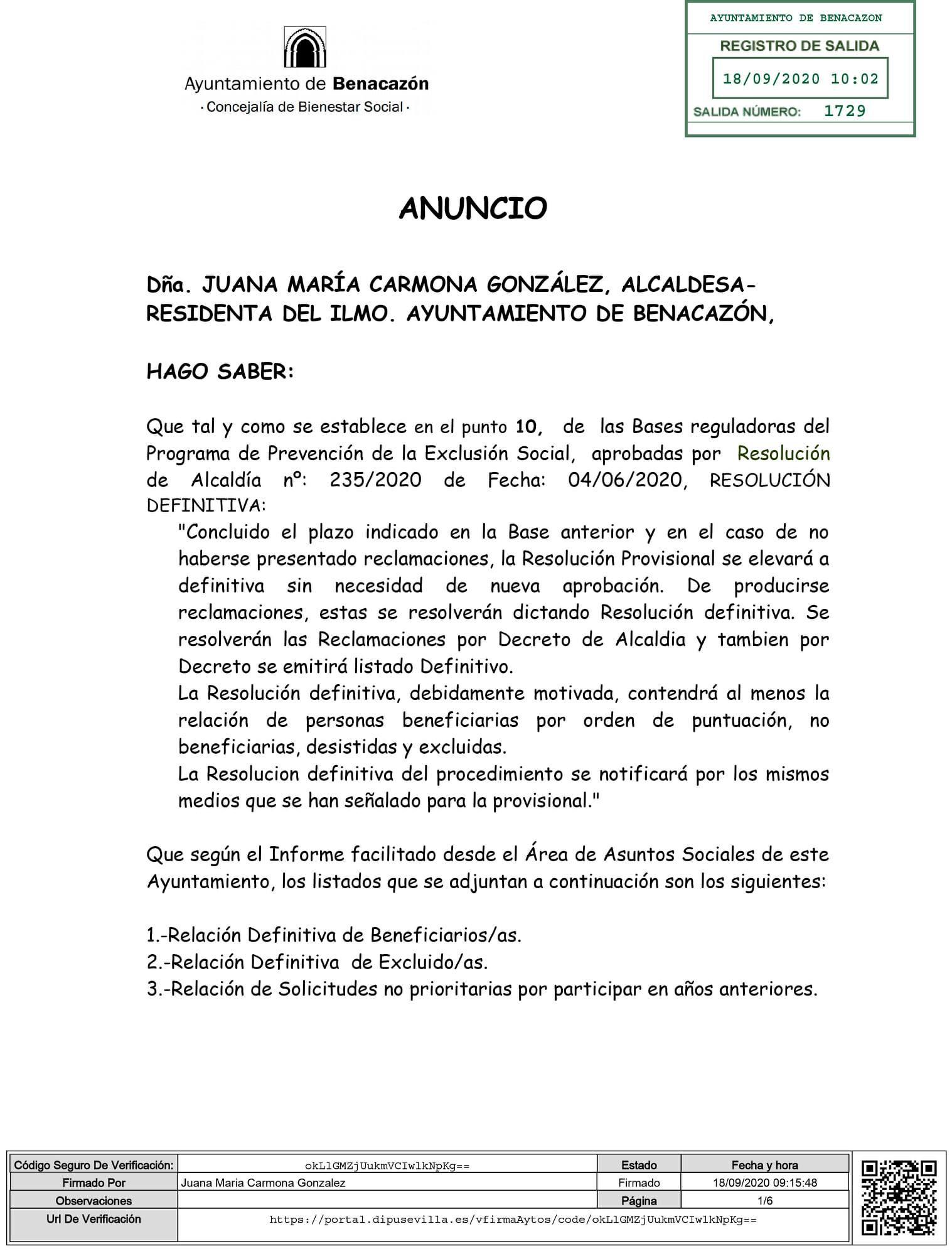Desde el Ayuntamiento de Benacazón te informamos que, tal y como se establece en el punto 9 de las Bases reguladoras del Programa de Prevención de la Exclusión Social, aprobado por Resolución de Alcaldía nº: 235/2020 y, tras la publicación de su Resolución Provisional hace unos días, se hace pública la Resolución Definitiva que incluye la relación de personas beneficiarias, excluidas y no prioritarias del citado Programa.
