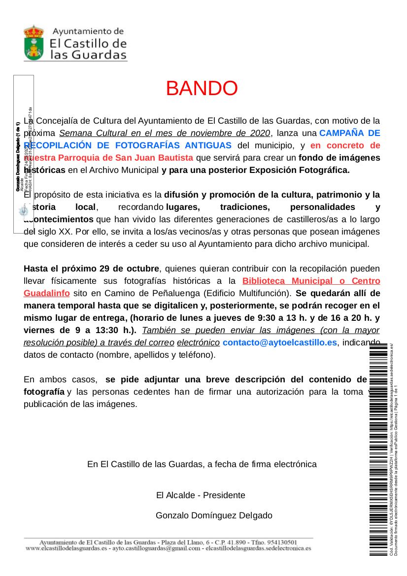El Ayuntamiento de El Castillo de las Guardas por medio del siguiente Bando, solicita la colaboración ciudadana para poner en marcha la CAMPAÑA DE RECOPILACIÓN DE FOTOGRAFÍAS ANTIGUAS de nuestro municipio, y en concreto, de nuestra Parroquia de San Juan Bautista para la creación de un archivo fotográfico con la que recuperar la memoria histórica de al menos los últimos 100, y que sirva de soporte para la puesta en marcha de un proyecto de Exposición Fotografica con motivo de la próxima Semana Cultural en el mes de noviembre de 2020.