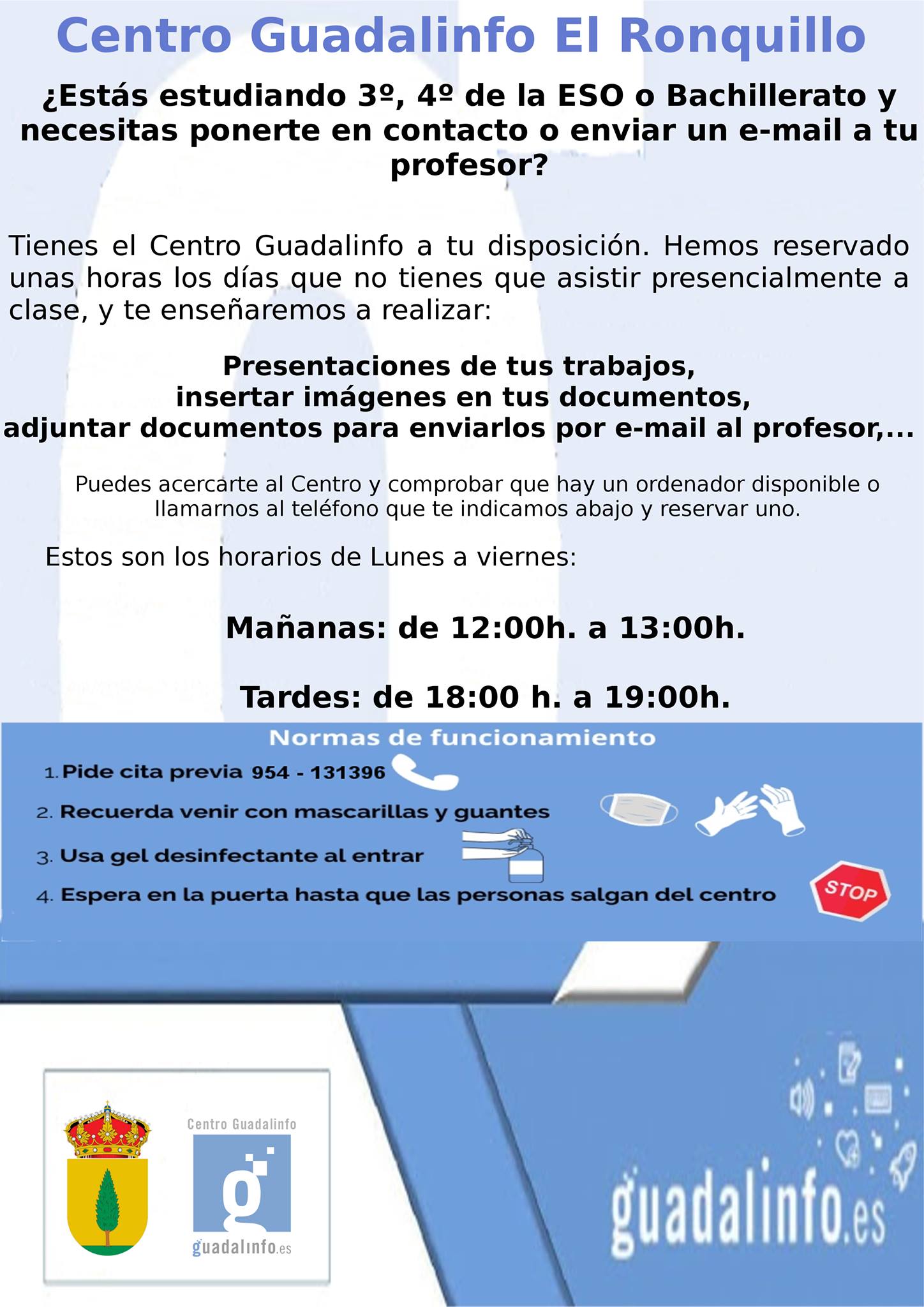 El Centro Guadalinfo se pone a disposición de l@s estudiantes de 3º, 4º de la ESO y Bachillerato en horario de 12:00 a 13:00 h y de 18:00 a 19:00 h de lunes a viernes.
