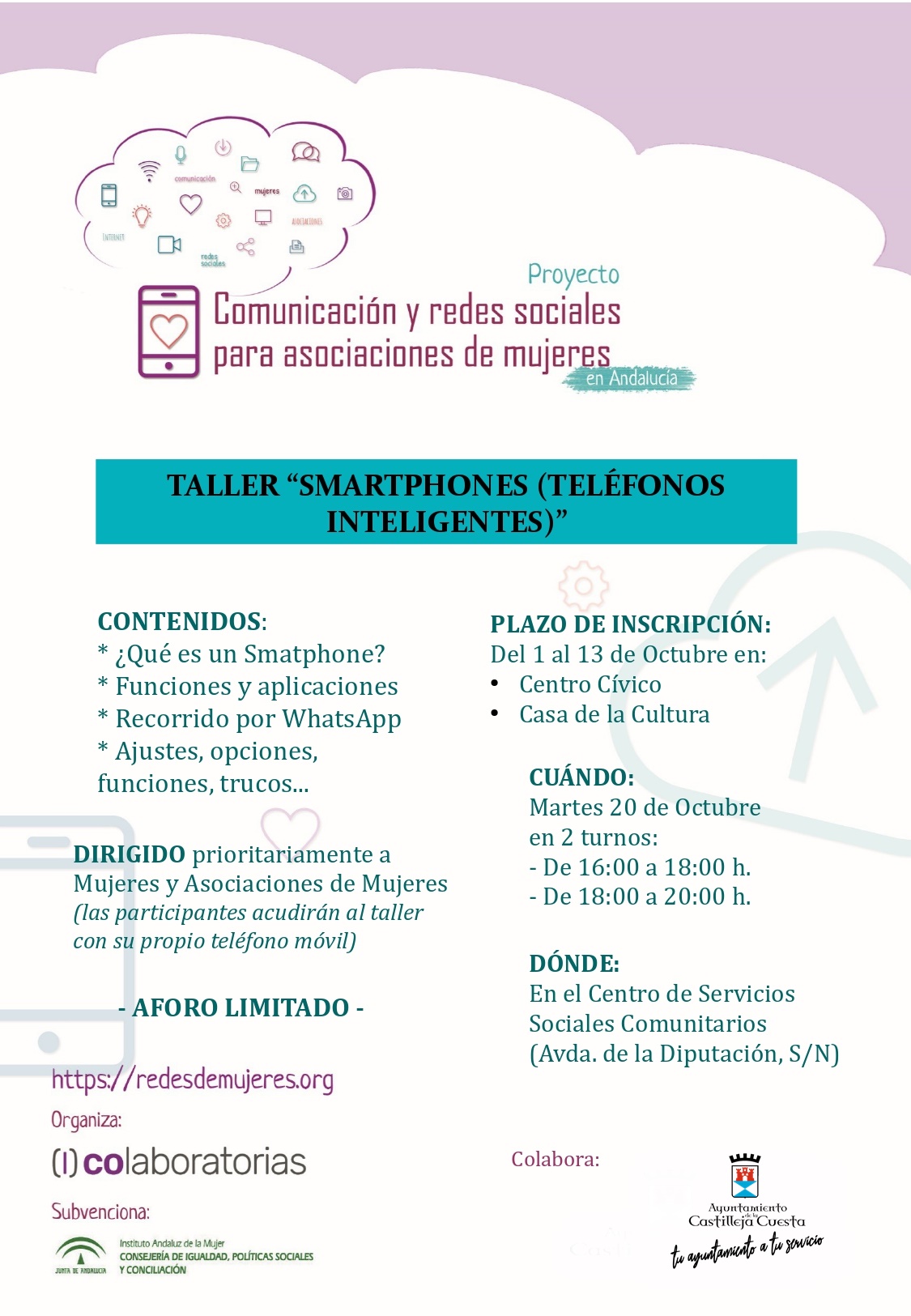 Fecha inicio Jue, 01/10/2020 - 09:49 Fecha fin Mar, 20/10/2020 - 09:49 Imágenes Ubicación Categoría evento Bienestar social Mostrar en el carrusel de la sección No Más información http://www.castillejadelacuesta.es/es/actualidad/eventos/Taller-sobre-Smartphon…