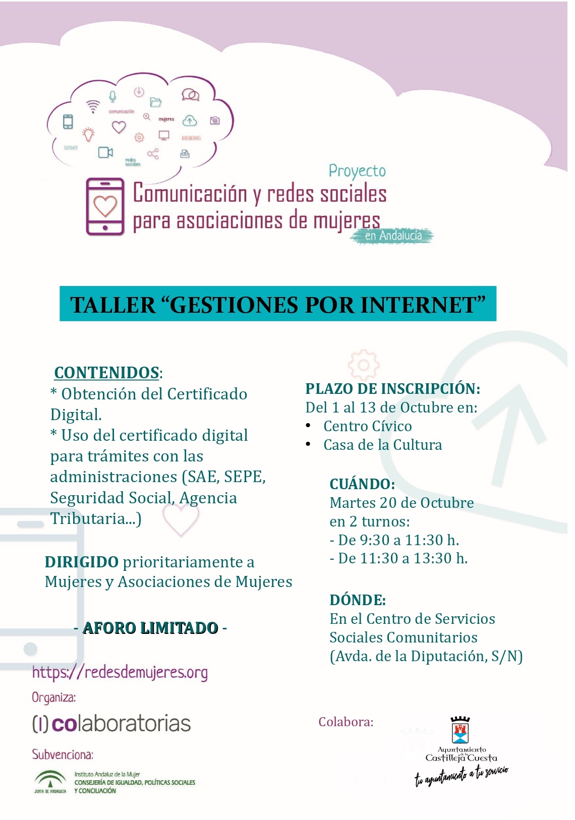 Fecha inicio Jue, 01/10/2020 - 09:47 Fecha fin Mar, 20/10/2020 - 09:47 Imágenes Ubicación Categoría evento Bienestar social Mostrar en el carrusel de la sección No Más información http://www.castillejadelacuesta.es/es/actualidad/eventos/Taller-Gestiones-por-I…