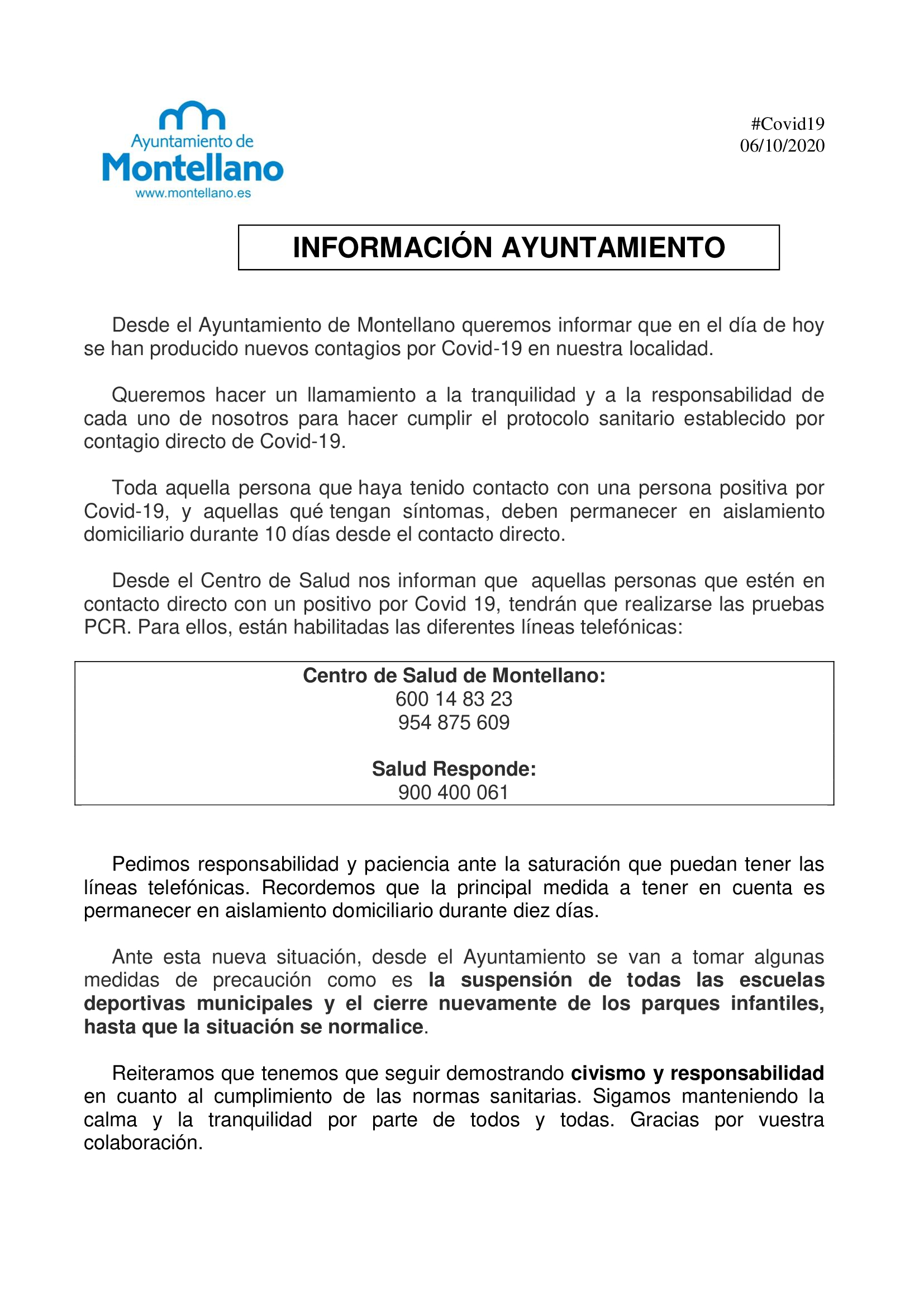 Desde el Ayuntamiento de Montellano queremos informar que en el día de hoy se han producido nuevos contagios por Covid-19 en nuestra localidad.