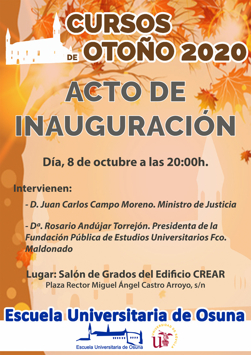 Los Cursos de Otoño de la Escuela Universitaria de Osuna tienen un carácter gratuito tanto para el alumnado como para toda persona que esté interesada en alguno de los temas que se van a tratar en esta edición y tienen como finalidad continuar con ese marcado objetivo de poner en valor el conocimiento y la cultura encaminados hacia la formación de calidad y hacia el máximo grado de excelencia.