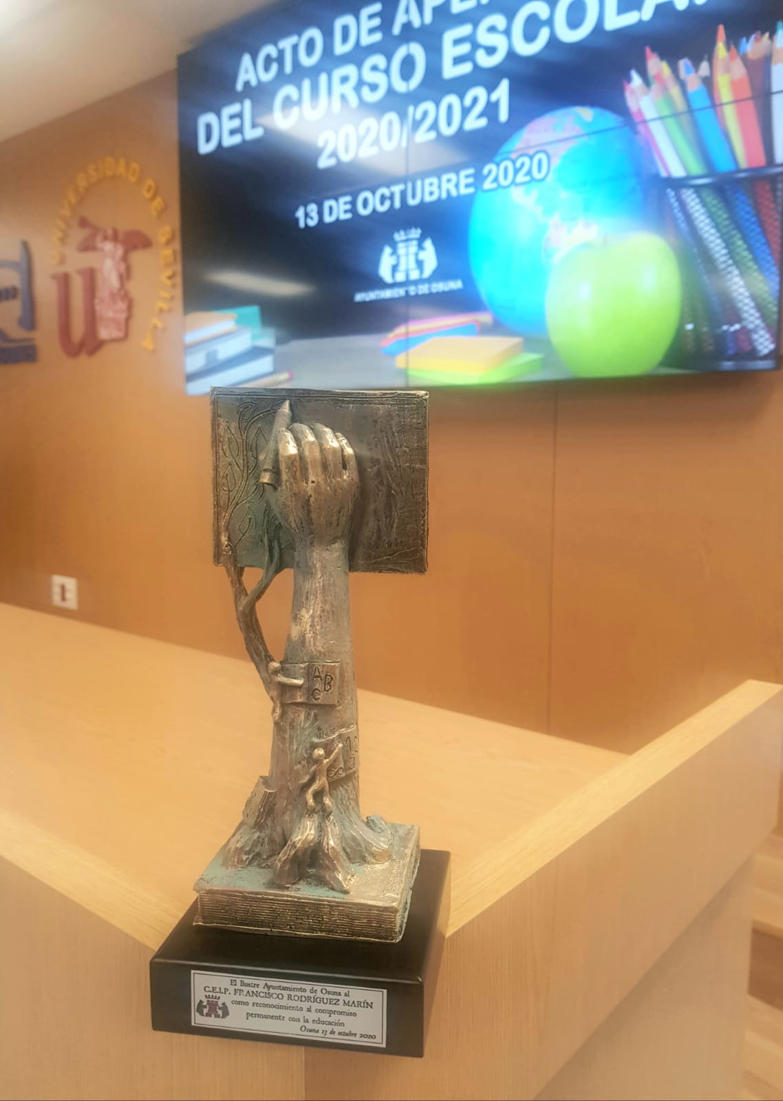 Para finalizar este acto oficial de apertura del curso escolar, la alcaldesa de Osuna ha hecho entrega a cada uno de los directores y directoras de los centros educativos de la localidad de una estatuilla en forma de árbol y de cuyas manos brota una mano que escribe sobre una pizarra, decorado además con otros elementos propios de la enseñanza, con el que se ha querido reconocer el compromiso permanente del profesorado con la educación.