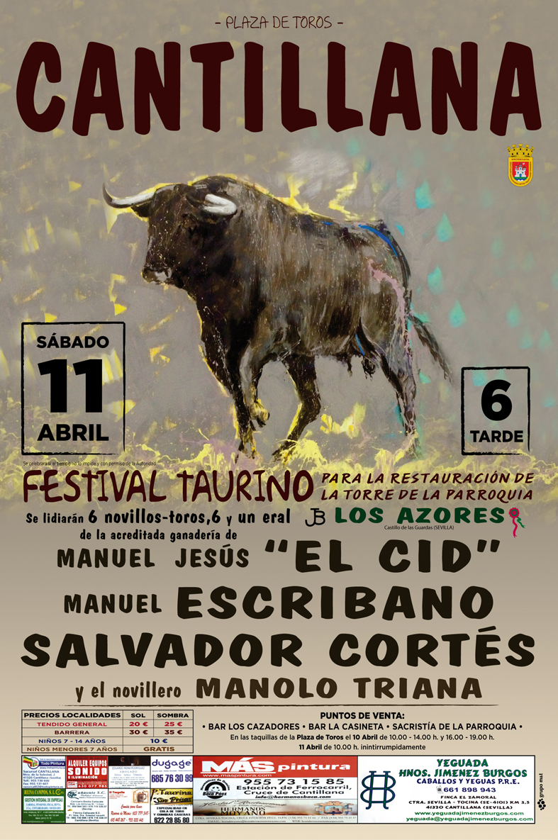 El próximo sábado 11 de abril, la Plaza de Toros de Cantillana acogerá el festival taurino que contribuirá a aportar fondos para la restauración de la torre de la parroquia. Contaremos con grandes figuras del toreo como Manuel Jesús "El Cid", Salvador Cortés y/o Manuel Escribano; y con el novillero Manolo Triana. Los precios oscilan entre 10 y 35 euros, siendo gratuita la entrada a menores de siete años. Asimismo, podremos adquirir las entradas en diferentes puntos de venta: bar "Los Cazadores"; bar "La Casineta"; sacristía de la parroquia; o las taquillas de la Plaza de Toros el 10 de abril en un horario comprendido de 10:00 a 14:00 horas y de 16:00 a 19:00 horas o el mismo día de la corrida de toros.