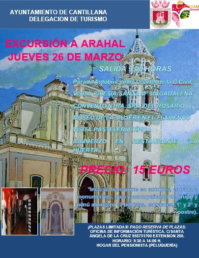 La Delegación de Turismo del Ayuntamiento de Cantillana organiza para el próximo jueves, 26 de marzo, una excursión a Arahal. La salida tendrá lugar las 09:00 horas de este mismo día en la parada de autobús ubicada frente al Cuartel de la Guardia Civil.