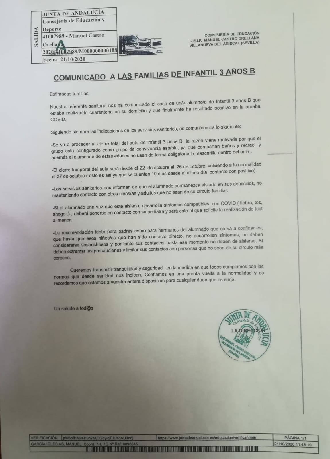 (Ir a la información) Según la estadística, continuamos en los mismos números de ayer. La novedad de hoy estriba en el CEIP Manuel Castro Orellana donde en aplicación del protocolo del centro, se ha clausurado un aula tras confirmarse un positivo. Esta persona no acudía al aula desde hacía 5 días, pero de conformidad con el protocolo del centro y las autoridades sanitarias, se ha optado por el cierre. El Ayuntamiento acometerá esta misma tarde una limpieza especial y desinfección general de las instalaciones afectadas. Insistimos en que es necesario seguir cumpliendo con las recomendaciones sanitarias del Ministerio de Sanidad y la Consejería de Salud y Familias para la prevención: mascarilla, lavado frecuente de manos, distancia de seguridad... y sobre todo, no atender a bulos e informaciones malintencionadas (que sólo pretenden alarmar a la población buscando un enfrentamiento que ahora no precede), sino a la que surja de los cauces oficiales. Muchas gracias a todos. #VillanuevaDelAriscal #EntreTodosNosCuidamos