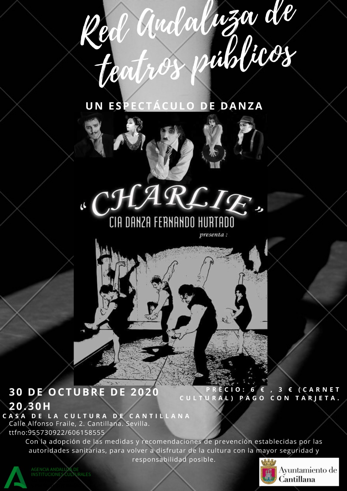 La Compañía de Danza Fernando Hurtado rinde tributo a Charles Chaplin este viernes 30 de octubre a las 20´30h en la Casa de la Cultura, con su espectáculo "Charlie", basado en la vida y las películas del inmortal Charlie Chaplin. Sensacional espectáculo candidato a los "Premios Max 2014" y premiado con el "Premio FETEN 2012". Se trata de una retrospectiva de la vida del genial artista Charles Chaplin en clave de teatro, coreografías, proyecciones etc. en un montaje espectacular y muy divertido para todos los públicos.