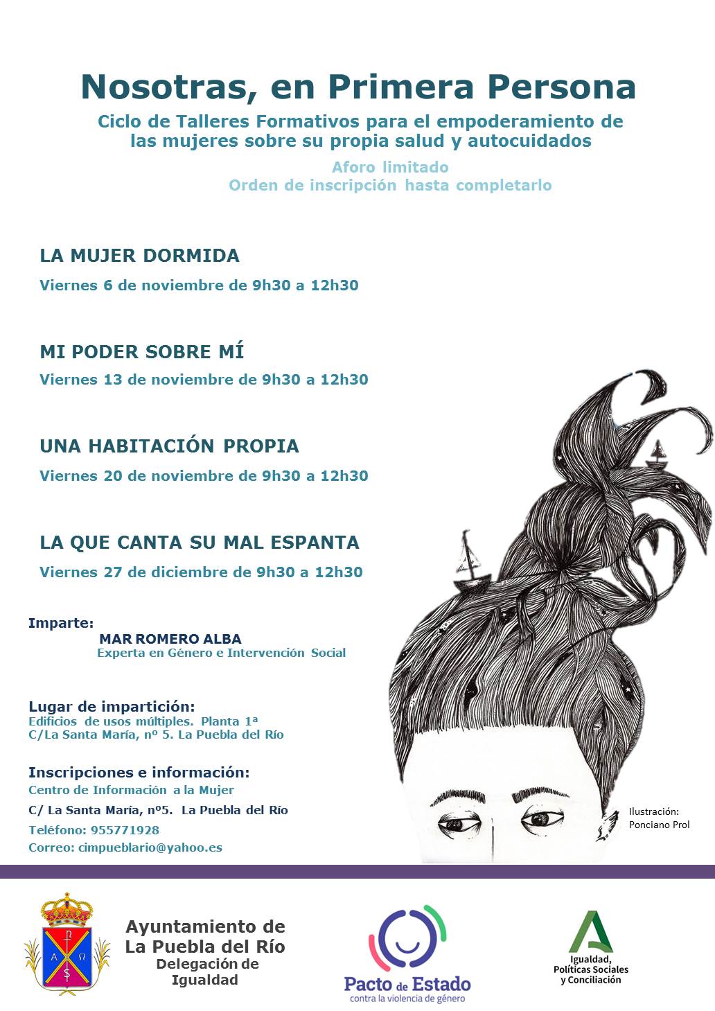 Desde la Delegación de Igualdad del Ayuntamiento de la Puebla del Río se pone en marcha el ciclo "Nosotras, en primera persona". Este ciclo formativo consta de 4 monográficos independientes, pero interrelacionados entre ellos, que tienen como objetivo facilitar la toma de conciencia, el crecimiento y el empoderamiento de las mujeres participantes sobre su propia salud y autocuidados, su propia autonomía y su disfrute.
