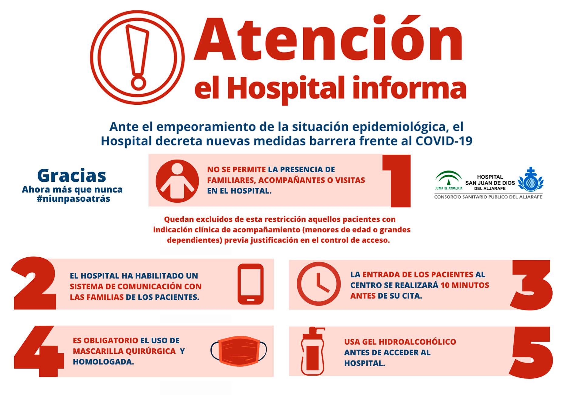 Desde el Ayuntamiento de Benacazón te trasladamos la campaña informativa realizada por el Hospital San Juan de Dios de Bormujos, centro médico de referencia para más de 300.000 personas del Aljarafe sevillano, ante el empeoramiento de la situación epidemiológica. Esta campaña contiene una serie de medidas barrera contra la Covid-19 que ya se están aplicando, con el objetivo de proteger a usuarios y profesionales médicos.