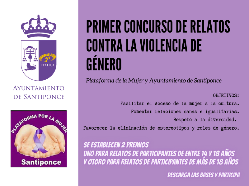 El Ayuntamiento de Santiponce y la Plataforma por la Mujer de Santiponce, procede a convocar este primer concurso de relatos con motivo del DÃa Internacional Contra la Violencia de Género.
