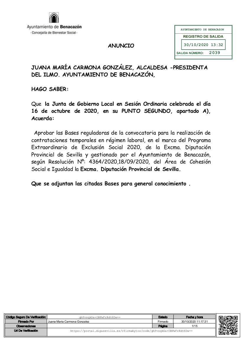 Desde el Ayuntamiento de Benacazón te informamos que la Junta de Gobierno Local en Sesión Ordinaria, celebrada el pasado 16 de octubre de 2020, acordó aprobar las Bases Reguladoras de la convocatoria para la realización de contrataciones temporales en régimen laboral, en el marco del Programa Extraordinario de Exclusión Social 2020, de la Diputación Provincial de Sevilla y gestionado por el Área municipal de Asuntos, según Resolución Nº: 4364/2020,18/09/2020, del Área de Cohesión Social e Igualdad la Diputación Provincial de Sevilla.