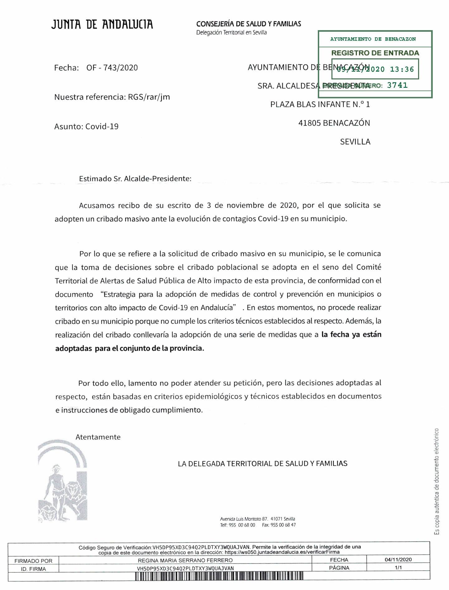Desde el Ayuntamiento de Benacazón te informamos sobre la respuesta de la Delegada Territorial de la Consejería de Salud y Familias de la Junta de Andalucía a la Alcaldesa de Benacazón, Juana Mª Carmona, tras haber solicitado el pasado 11 de noviembre la realización de un cribado masivo del municipio ante el preocupante aumento de casos registrados, cuya Tasa PDIA ascendía en ese momento a 1.063,4 positivos (proporción por cada 100.000 habitantes).