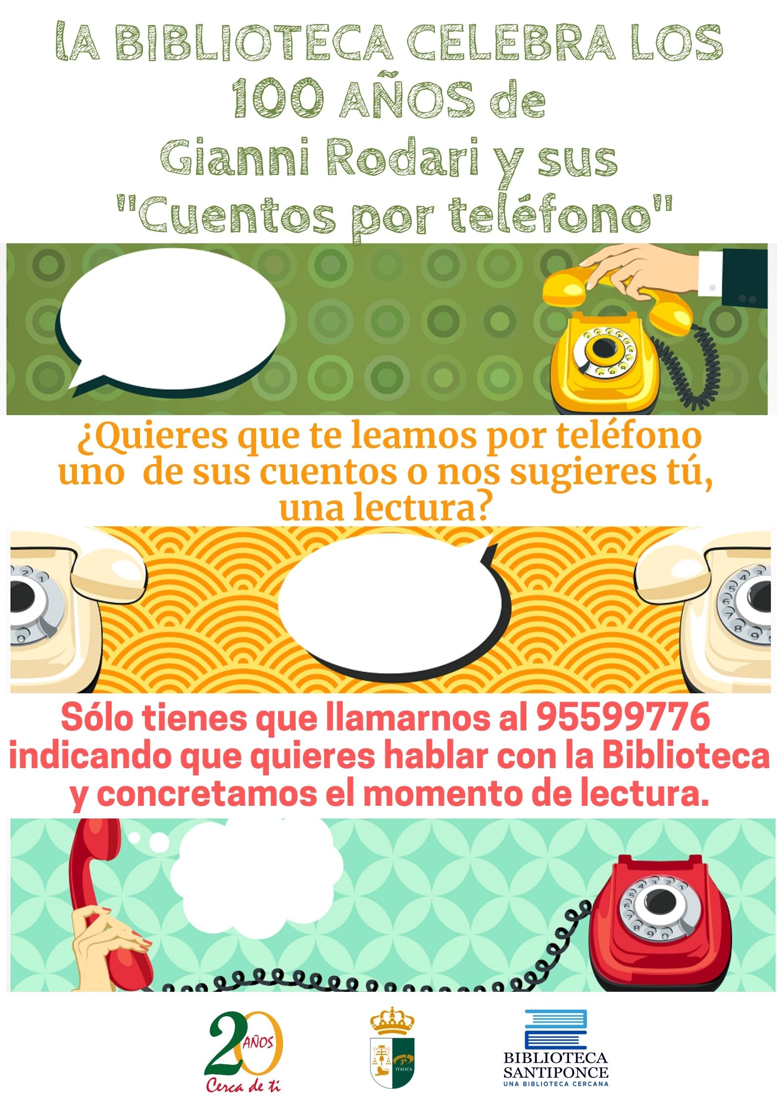 Te proponemos como homenaje a Rodari, a la literatura y al amor en estos tiempos de confinamiento, este servicio de lectura de historias, refranes y hasta adivinanzas que se hace vía telefónica. Sólo tienes que llamar al 955997776 y preguntar por la Biblioteca, a partir de ese instante, concretamos contigo el momento adecuado para leer y escuchar por el teléfono.
