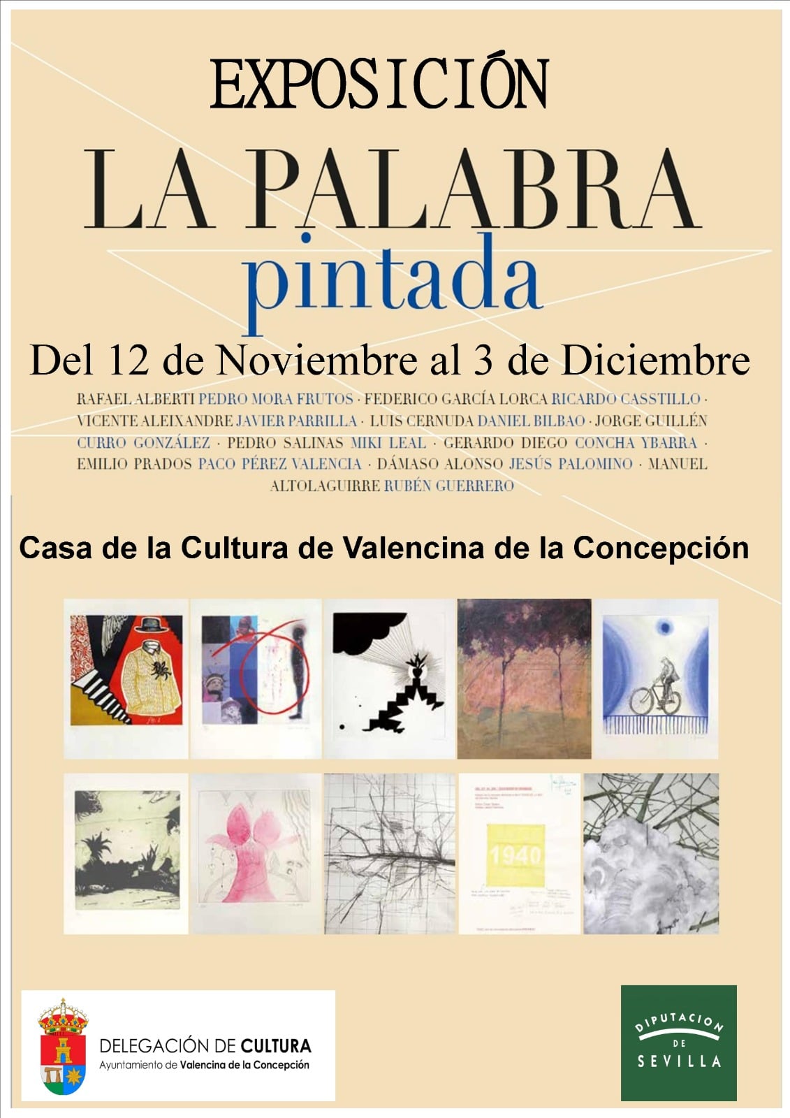 El Ayuntamiento de Valencina, a través de la delegación municipal de Cultura, organiza esta muestra, "La Palabra Pintada", concebida a partir de una edición de obra gráfica producida por el editor sevillano César Sastre.