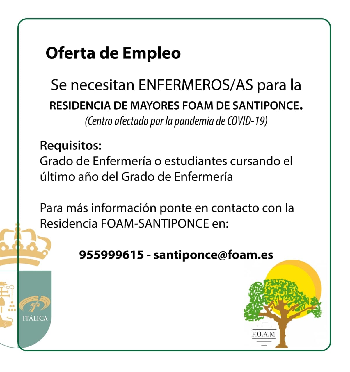 La Residencia de Mayores FOAM de Santiponce lanza una oferta de empleo para enfermeros/as en el centro, afectado por la pandemia COVID-19. El único requisito es ser Graduado en Enfermería o estar cursando el último año de dicho Grado.