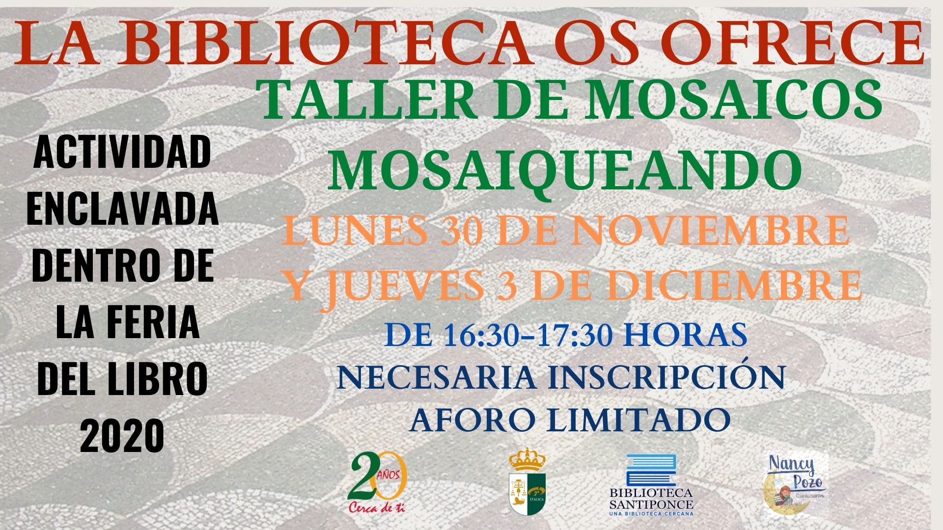 La primera actividad que os ofrecemos es el taller de mosaicos "Mosaiqueando" que realizaremos en la Biblioteca tanto hoy lunes 30 de noviembre como el día 3 de diciembre, en horario de 16:30 a 17:30. Al ser aforo limitado, es preciso saber el número de interesados e interesadas, que deberán inscribirse previamente en el correo bibliotecasantiponce@gmail.com o en el teléfono 955997776.