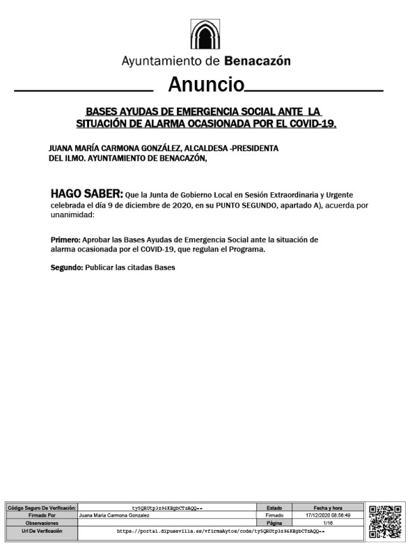 Desde el Ayuntamiento de Benacazón te informamos que la Junta de Gobierno Local en Sesión Extraordinaria y Urgente celebrada el día 9 de diciembre de 2020, en su punto segundo apartado A, acordó por unanimidad aprobar las Bases Ayudas de Emergencia Social ante la situación de alarma ocasionada por la COVID-19 que regulan el Programa. Puedes descargar las citadas bases en el enlace posterior al Listado Definitivo.